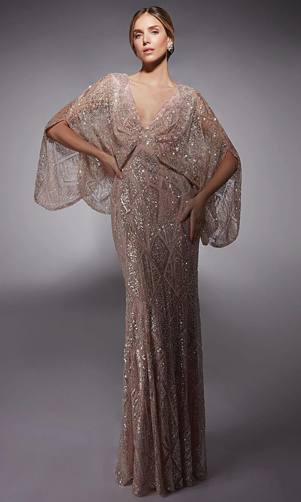 Go for full-on drama in this sparkling Alyce Paris 27756 creation. The gown delivers a blend of geometric sequin intrigue and graceful flow with its sequin-embellished pattern and sheer cape-style sleeves. The neckline and back offers a flattering V-shape, while the gently fitted sheath silhouette extends into a floor-length hem. Softly sheer sleeves add a touch of movement and visual lightness to the richly textured design. Alyce Paris 27756 is the perfect marriage of artistry and elegance for any formal gathering. Model is wearing Cameo Pink color.