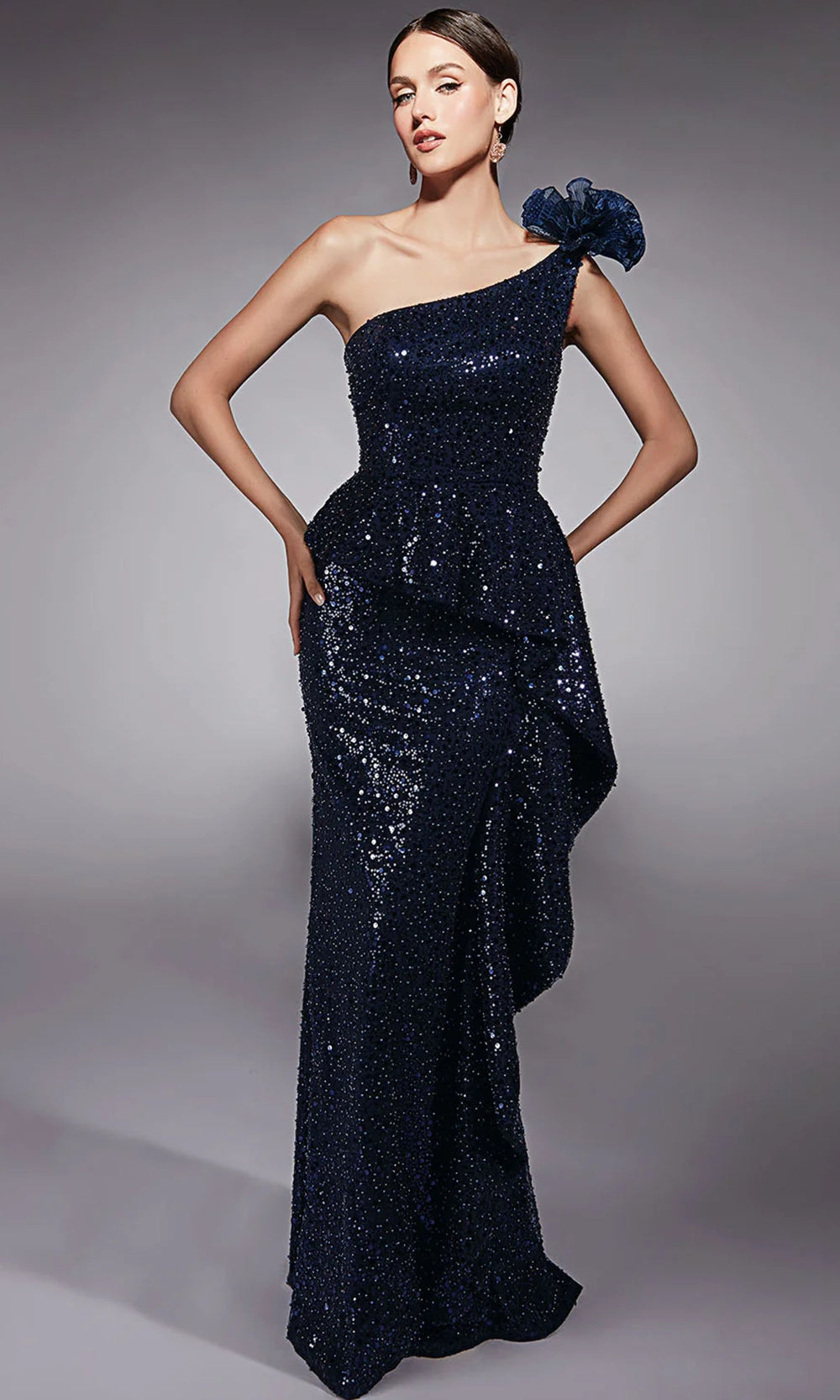 An effortlessly graceful look emerges in this floor-length silhouette, revealing Alyce Paris 27770 style in a show-stopping one-shoulder design with a sculpted peplum detail. This ensemble features a structured floral accent at the one shoulder strap, intricate beaded sequin embellishments, and a fluid sheath skirt that extends into a subtle train. With a side ruffle draped and natural waistline, it highlights curves while maintaining an elegant flow. The overall composition brings together classic charm and modern sophistication. Alyce Paris 27770 remains an exceptional choice for refined taste and high-impact glamour. Model is wearing Navy color.