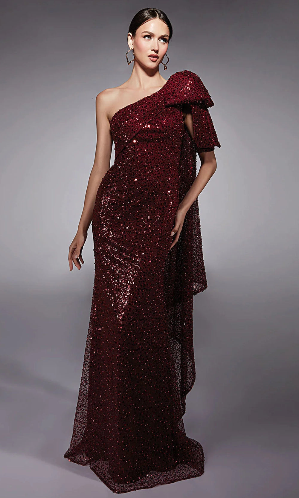 Sophisticated sparkle meets artistic structure in the Alyce Paris 27771 gown. Designed with a sultry asymmetric neckline and mid-open back, this piece features an oversized bow that cascades into a sheer illusion train. The sheath silhouette flatters the figure while the allover sequin and beaded pattern adds dimensional brilliance. A natural waist creates definition and complements the sweeping shape. Alyce Paris 27771 captures the perfect balance of contemporary glam and timeless beauty for elegant formalwear moments. Models are wearing Navy, and Wine colors.