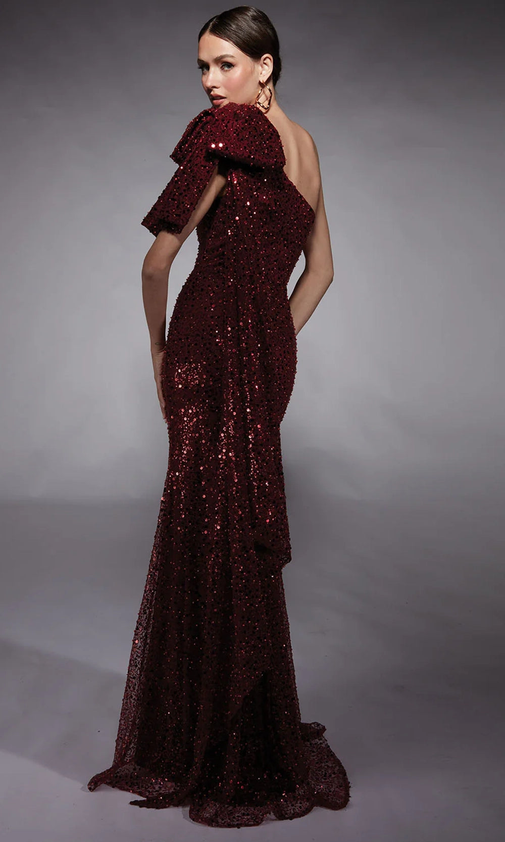 | Details: | One Shoulder Design, Oversized Bow Draped, Sweep Train, Beaded, Sequin, Mid-Open Back |