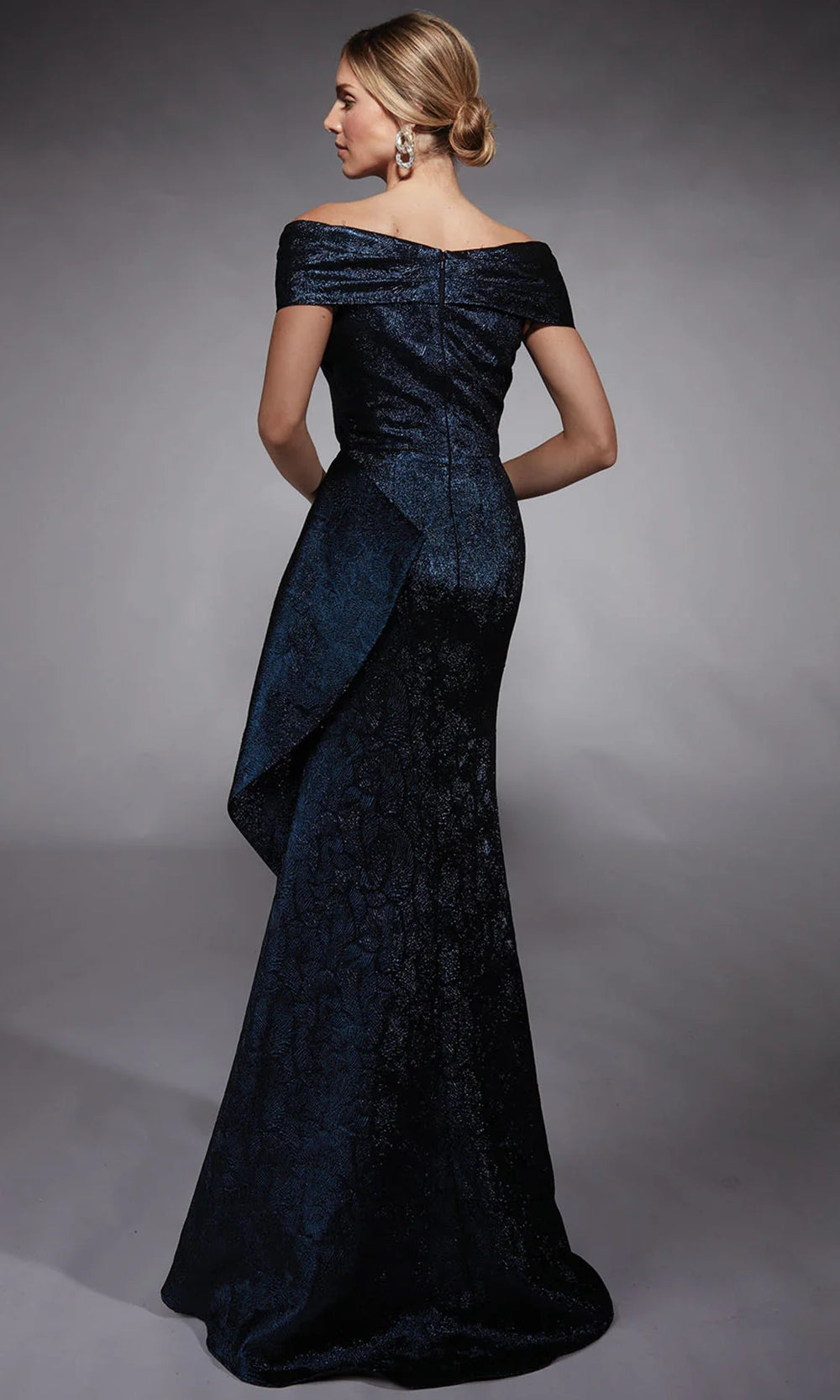 A sense of subtle grandeur defines this creation, culminating in the sculpted silhouette of Alyce Paris 27774 style. The off-shoulder neckline draws attention to the decolletage, complemented by a twist-front detail, cap sleeves and a contoured mermaid shape. Its jacquard texture adds depth while the softly draped skirt lends balance to the figure. The natural waistline emphasizes proportion, making it both polished and refined. Alyce Paris 27774 is a gown that communicates style through tailored structure and delicate accents, ideal for those with a penchant for elegant statements. Model is wearing Navy color.