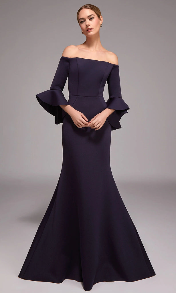 | Details: | Off the shoulder neckline, dramatic flounce sleeves, fitted mermaid silhouette, clean structured tailoring, back zipper closure |