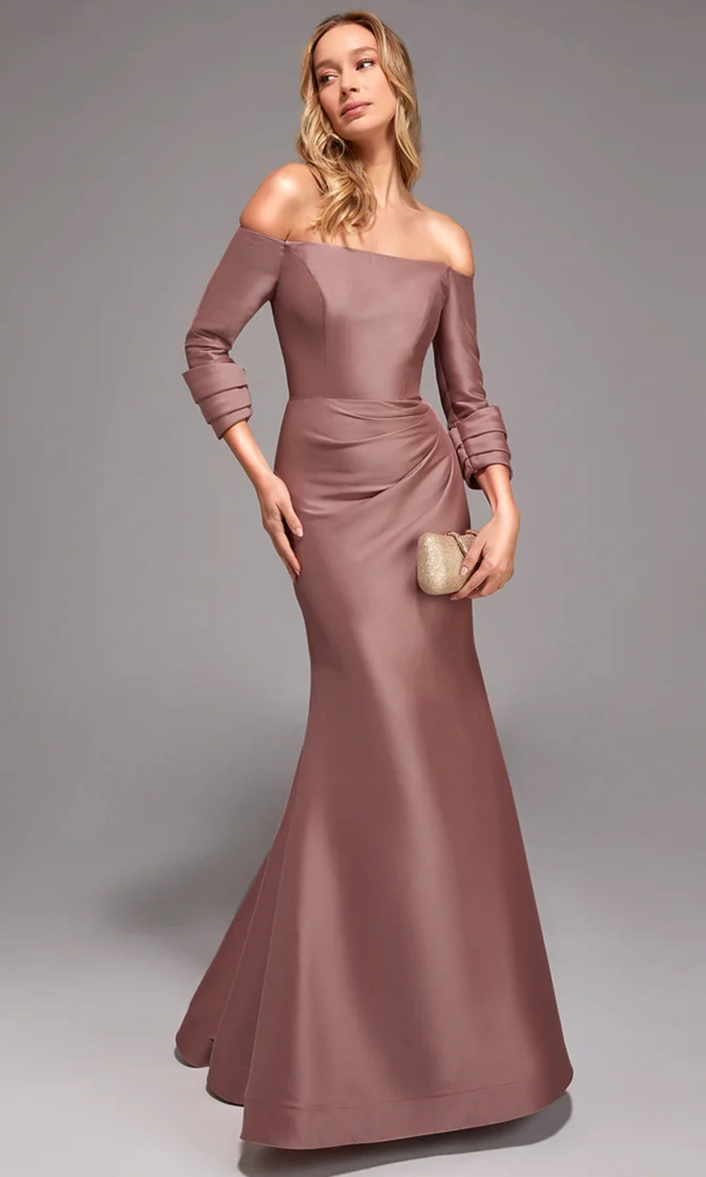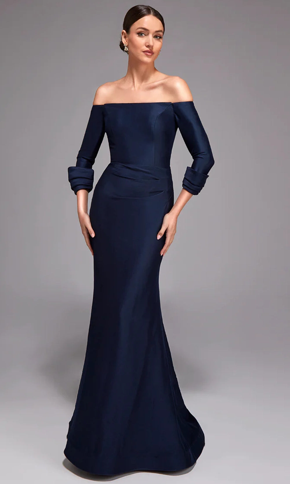 | Details: | Off the shoulder neckline, fitted silhouette, cuffed three quarter sleeves, pleated waist detail, sweep train |