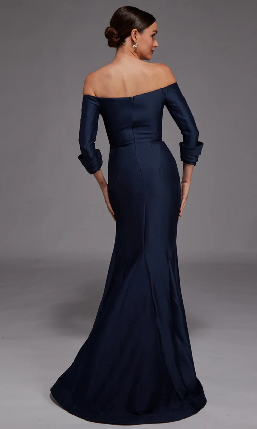 Alyce Paris Style 27782 is crafted for those who appreciate refined elegance with a modern twist. This gown features an off the shoulder neckline that highlights the collarbone beautifully, complemented by cuffed three quarter sleeves for a polished finish. The fitted silhouette creates a sleek and elongated shape, while the pleated waist detail subtly defines the figure. A graceful sweep train completes the design with understated drama. Choose Alyce Paris Style 27782 for your next special event and experience timeless sophistication in every step. Model is wearing Navy and Rosewood colors.