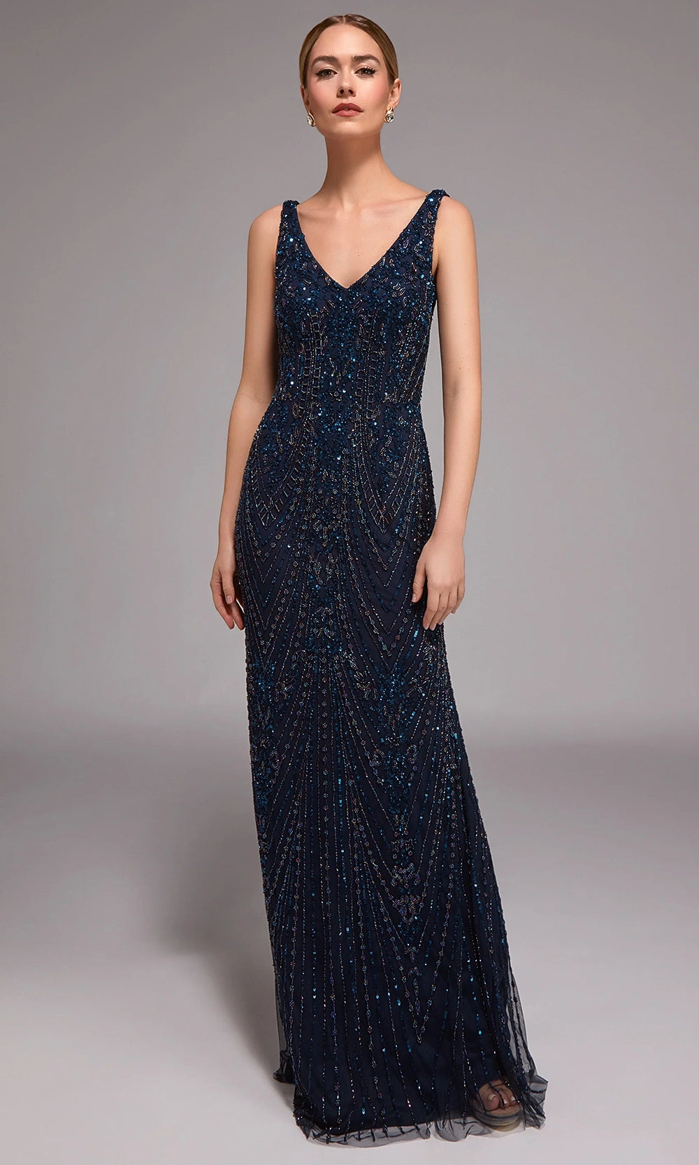 | Details: | Fully beaded pattern, sleeveless V neckline, V back, fitted sheath silhouette, floor-length design |