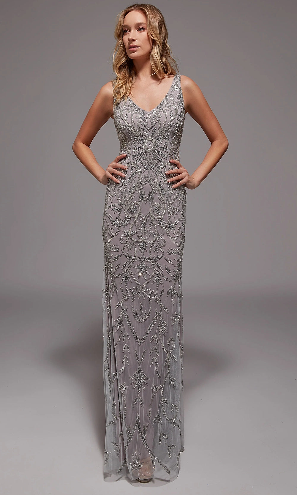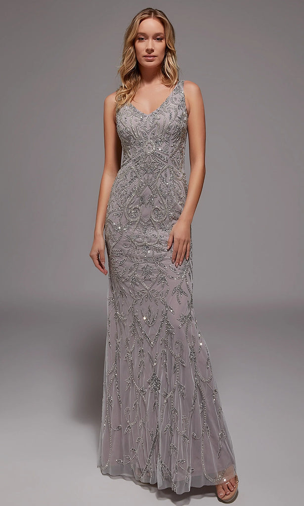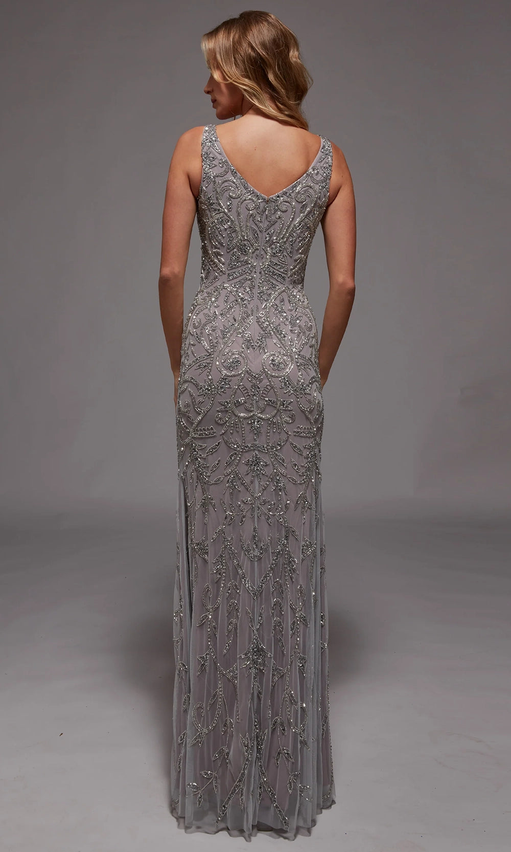 | Details: | V neckline, sleeveless bodice, fully beaded pattern, fitted silhouette, floor length skirt |