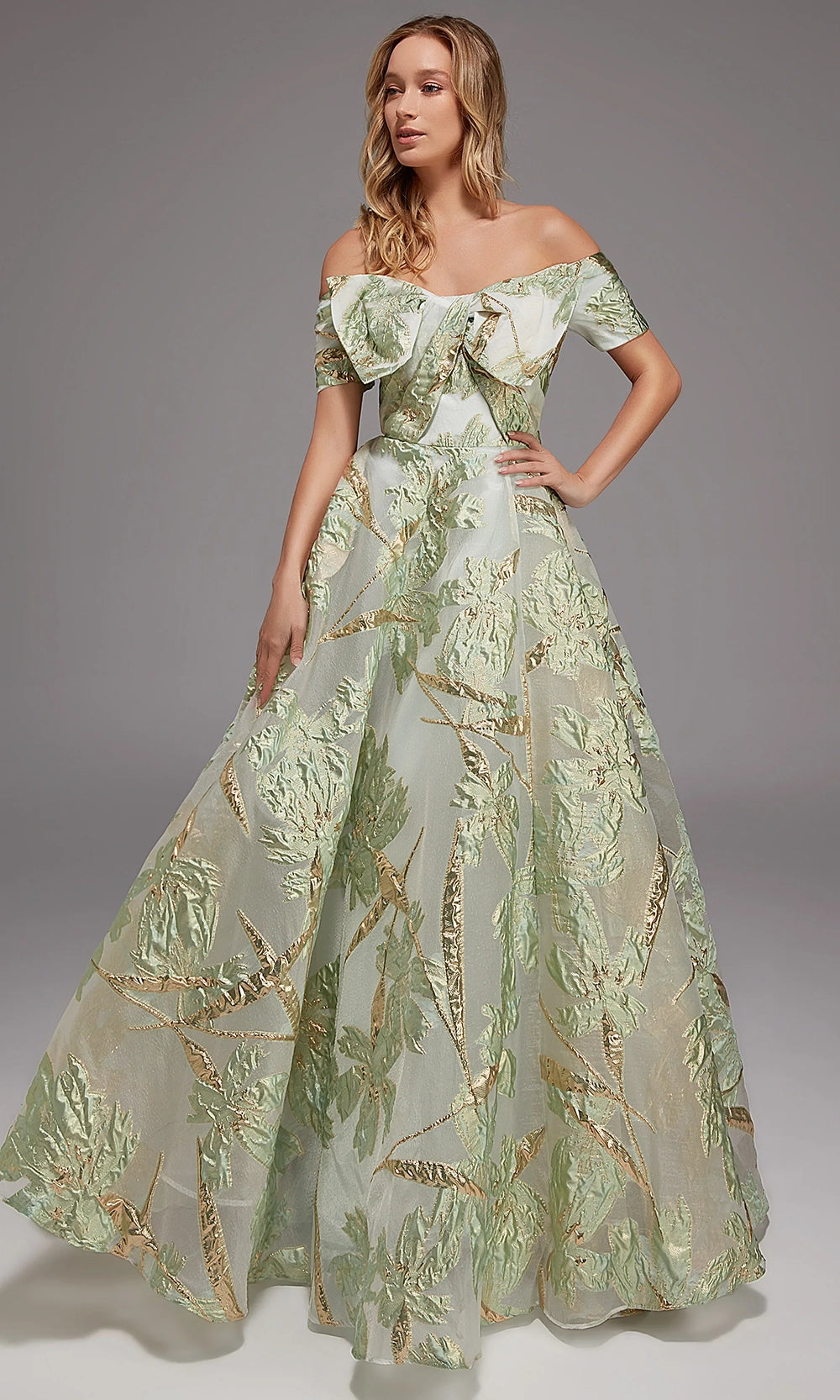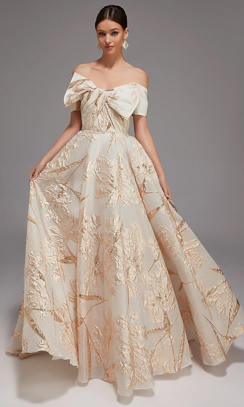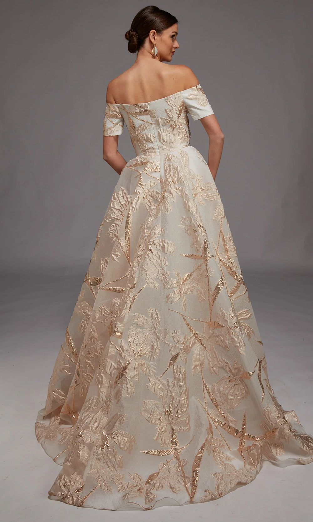 | Details: | Off shoulder neckline, ruffle bodice detail, metallic leaf motif design, full ball gown skirt, back zipper closure |