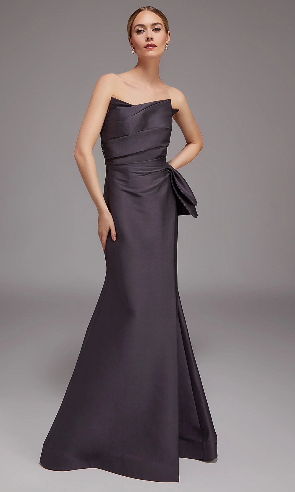 | Details: | Strapless neckline, asymmetrical pleated bodice, side bow detail, fitted mermaid silhouette, sweep train |