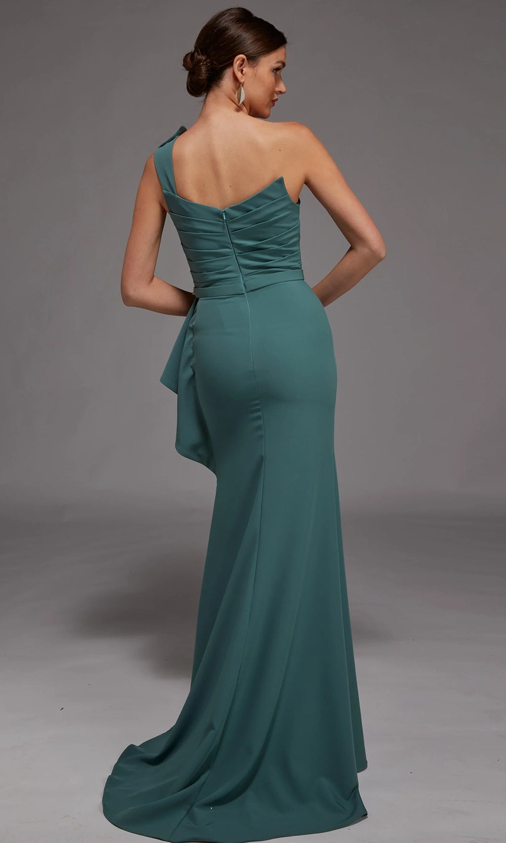 Alyce Paris Style 27812 exudes refined elegance with its chic one shoulder neckline and impeccably sculpted fitted silhouette. The tasteful ruching across the bodice enhances definition, while a sparkling beaded accent at the waist draws the eye to its beautifully draped cascade detail. Designed to move fluidly, the sweep train adds understated drama without overwhelming the look. Whether attending a gala, wedding, or upscale celebration, Alyce Paris Style 27812 delivers poised sophistication that makes every moment feel exceptional. Model is wearing Dark Sage and Icelandic Blue colors.