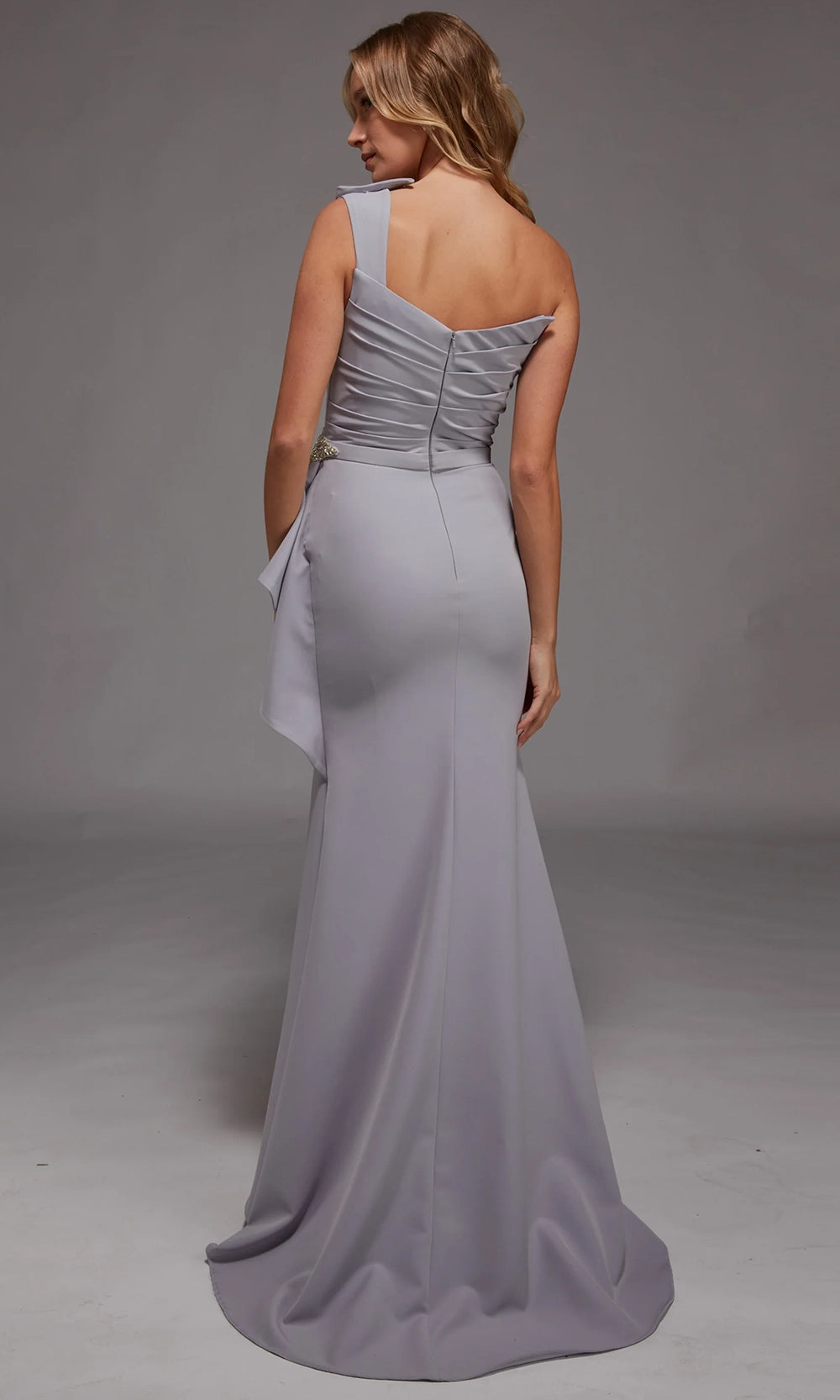 | Details: | One shoulder neckline, ruched bodice, beaded waist detail, draped side cascade, fitted silhouette, sweep train |