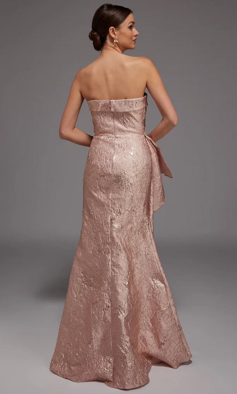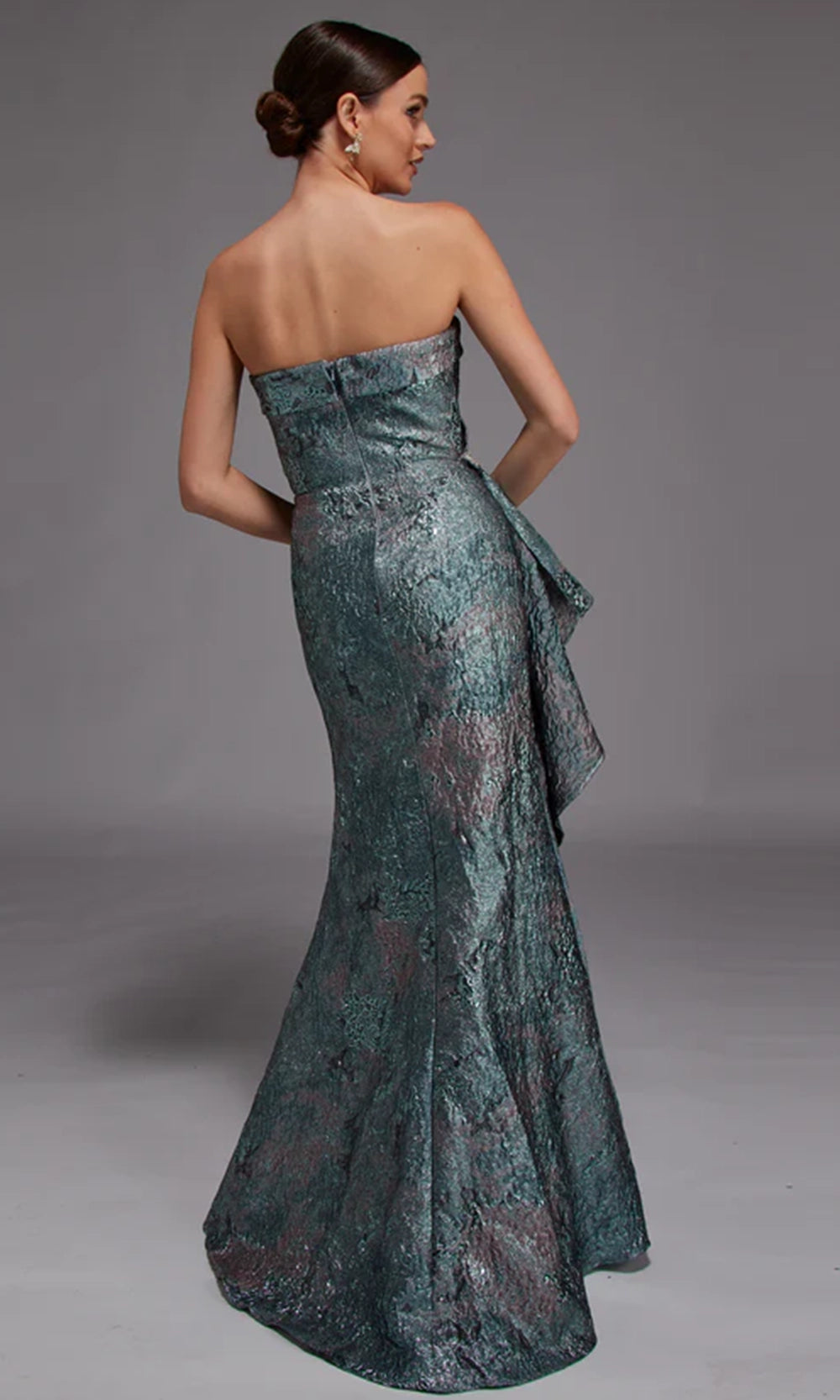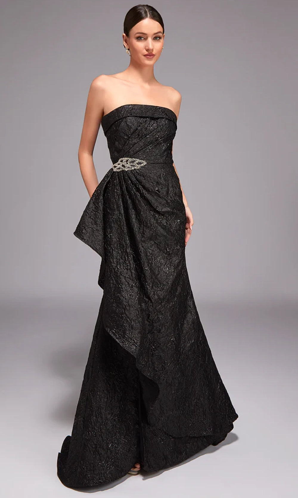 | Details: | Strapless neckline, textured jacquard fabric, asymmetrical peplum detail, fitted silhouette, floor length skirt, back zipper closure |