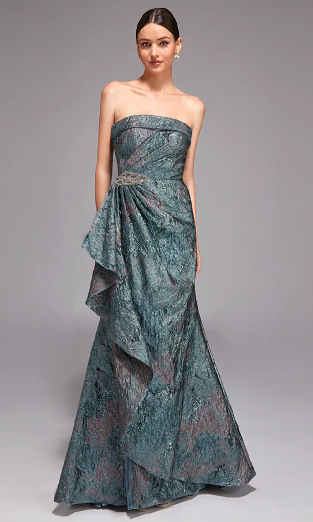 Step into refined sophistication with the Alyce Paris Style 27818, a beautifully tailored gown designed to elevate any formal event. Its strapless neckline creates a clean, timeless frame, while the textured jacquard fabric adds depth and luxurious dimension. The gown features an asymmetrical peplum detail that shapes the waist, flowing into a fitted silhouette that enhances natural curves. A graceful floor length skirt completes the refined look. Make your next special occasion unforgettable with the polished elegance of Alyce Paris Style 27818. Model is wearing Black, French Pink, and Verdigris colors.
