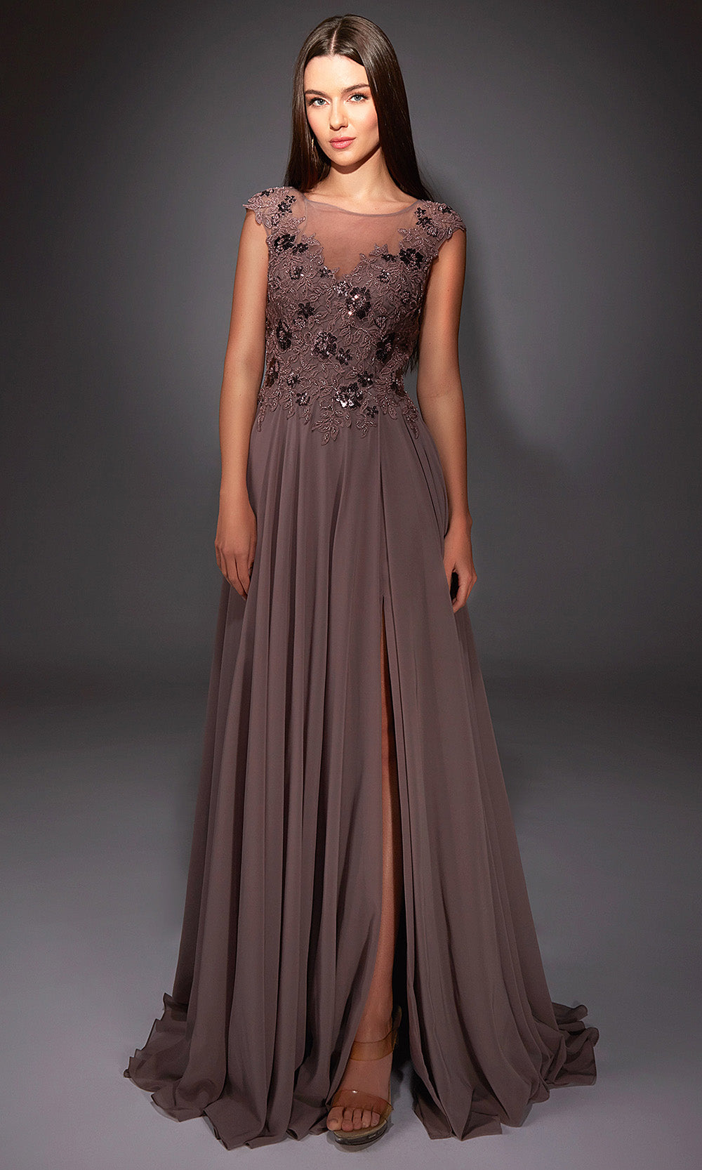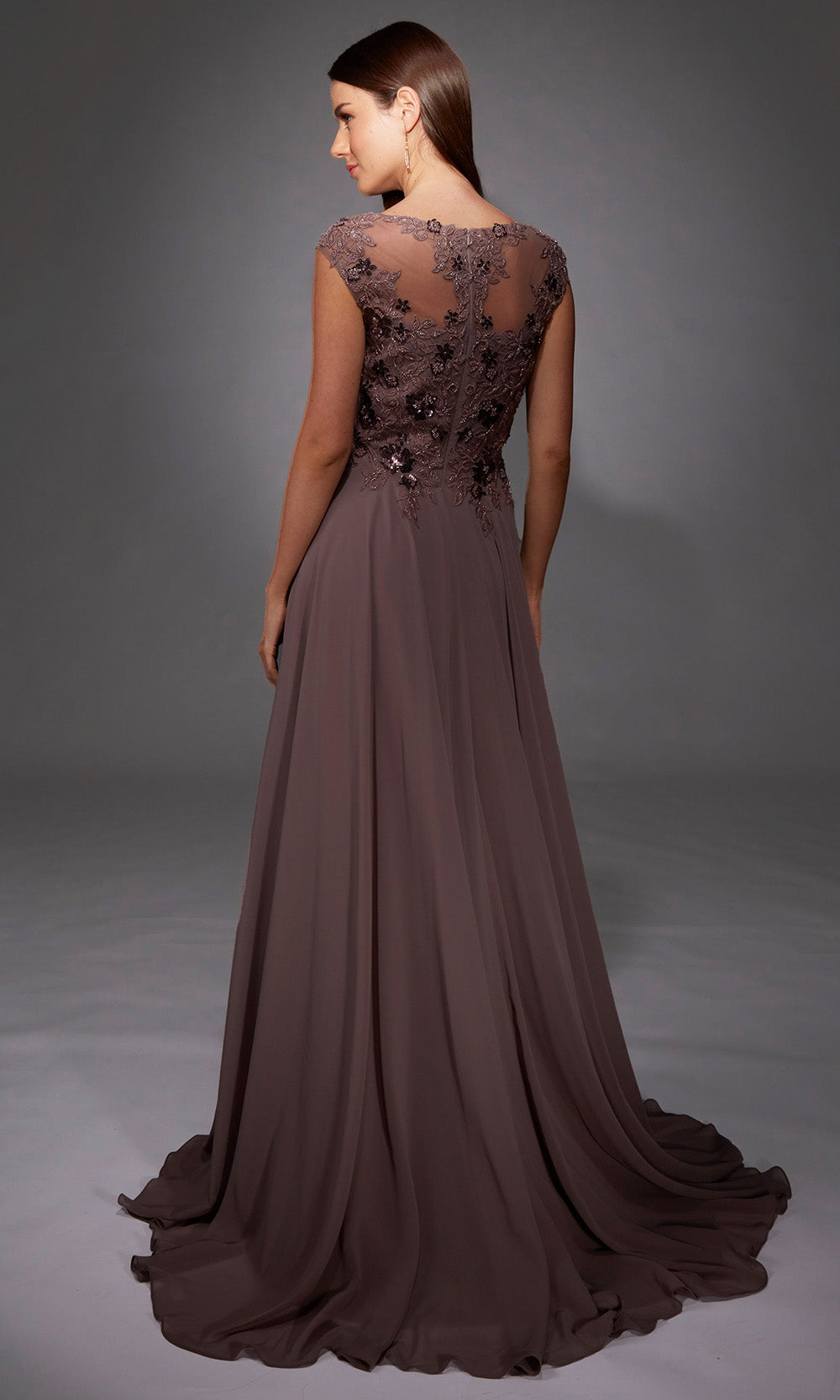 Soft elegance and striking detail unite in the Alyce Paris 27842 evening gown. The illusion bateau neckline pairs effortlessly with cap sleeves and a partially sheer back, creating a look that is both refined and alluring. Floral lace appliques and shimmering beadwork bring richness to the bodice, while the chiffon A-line skirt drapes effortlessly into a soft sweep train. A daring thigh-high slit adds modern flair while maintaining graceful movement throughout. Alyce Paris 27842 blends romantic texture with sleek tailoring making it an ideal choice for elegant celebrations. Models are wearing Heather, and Mocha colors.