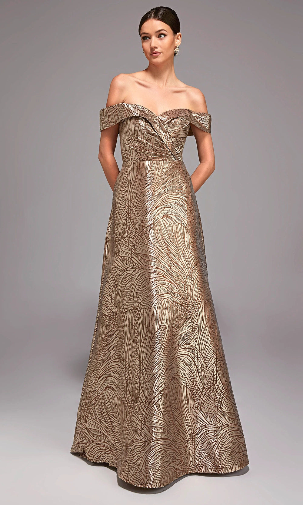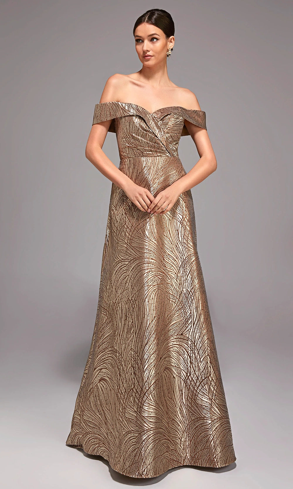 | Details: | Off the shoulder neckline, metallic jacquard fabrication, structured bodice, A-line silhouette, back zipper closure |