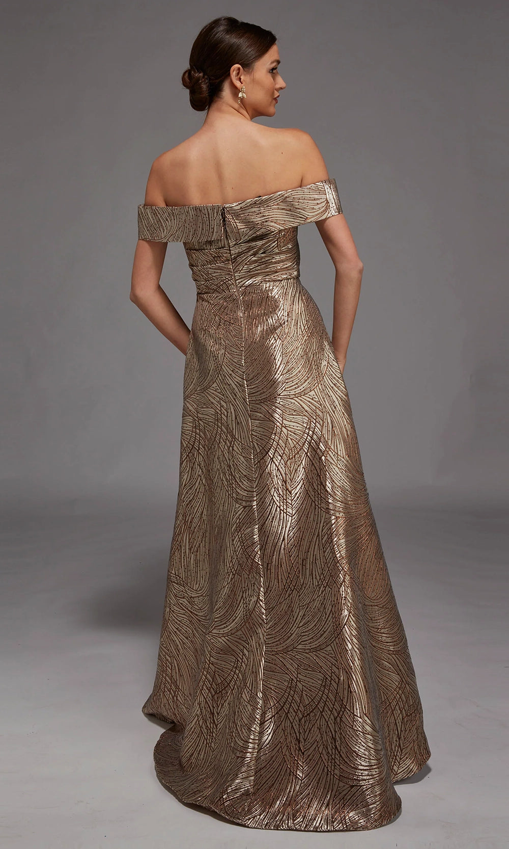 Alyce Paris style 27844 brings refined glamour to formal dressing with its striking design and elevated craftsmanship. The off the shoulder neckline frames the shoulders beautifully while the structured bodice enhances the figure for a flattering fit. Metallic jacquard fabrication gives the gown a luxurious texture with a luminous finish, and the A-line silhouette provides graceful movement ideal for dancing and photos. Whether for a gala, wedding, or red-carpet event, Alyce Paris style 27844 offers an unforgettable look that will make you feel stunning all night long. Model is wearing Cappuccino color.