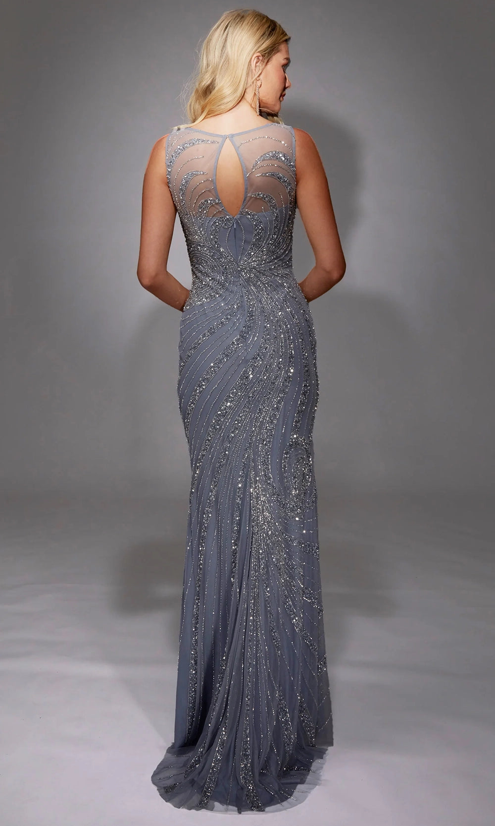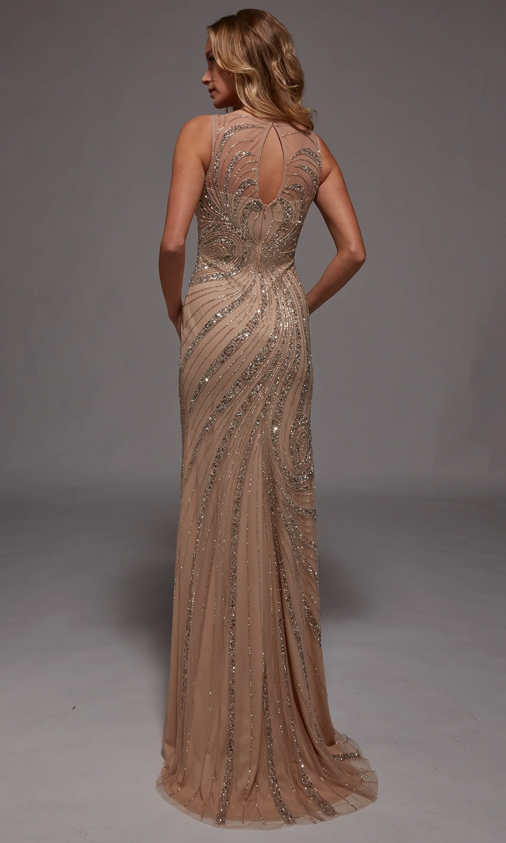 | Details: | Illusion neckline, fitted silhouette, swirling beaded pattern, sheer back keyhole, floor length hem |