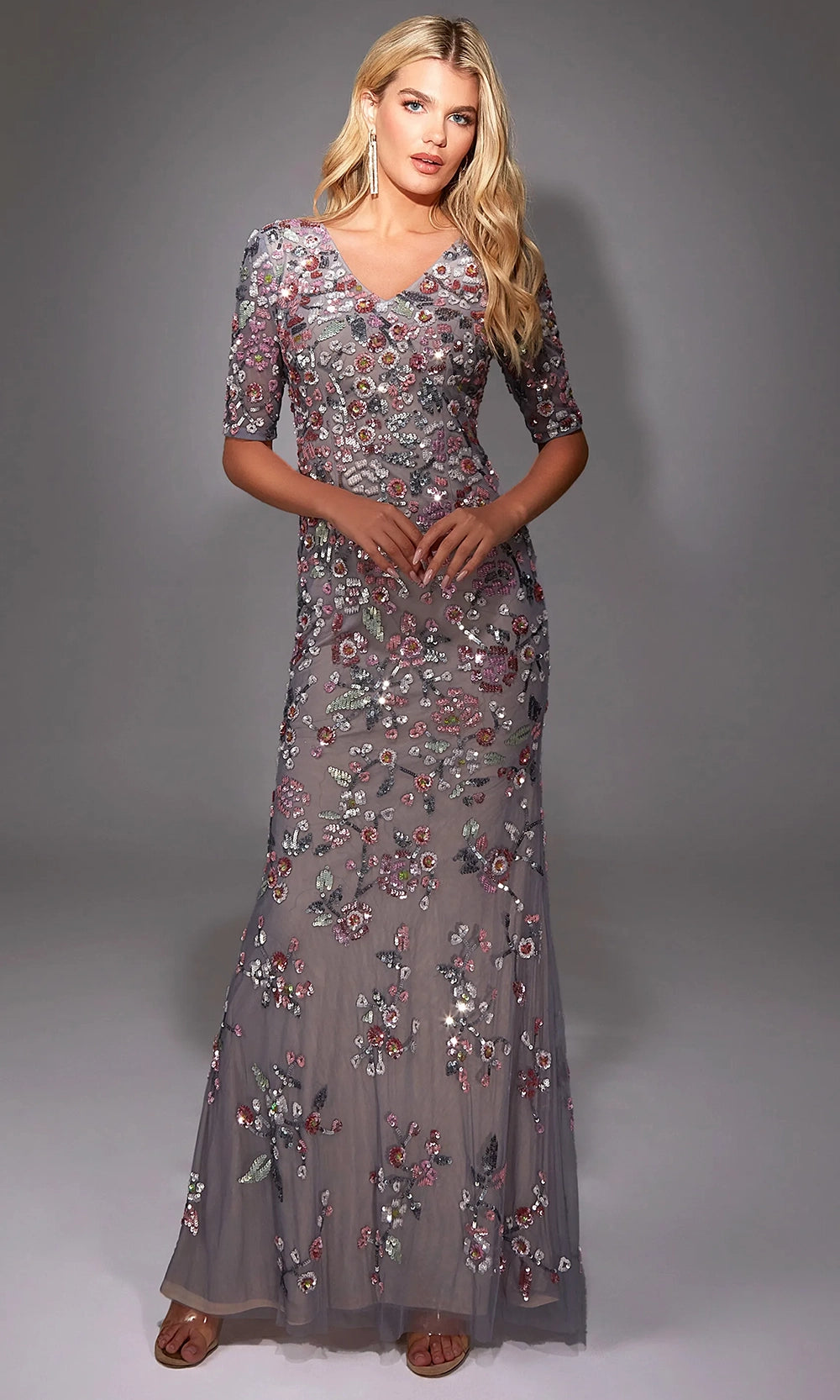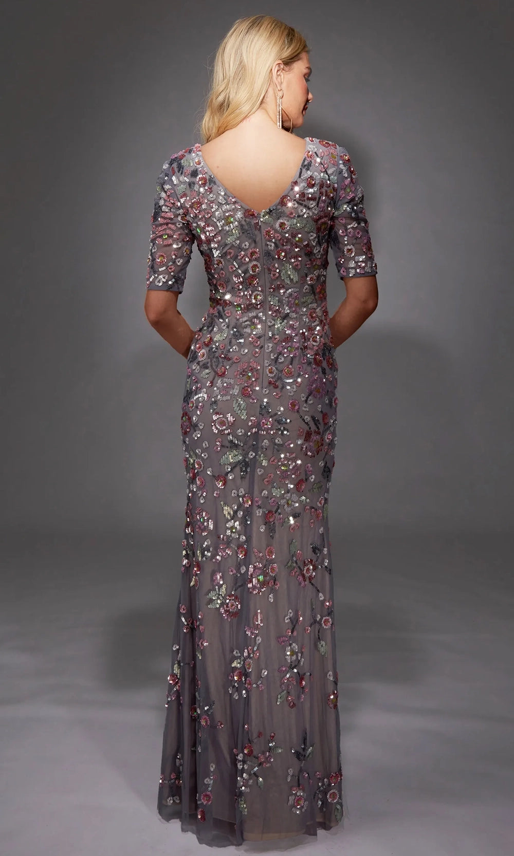 | Details: | Beaded floral applique, sheer illusion neckline and sleeves, gently fitted silhouette |