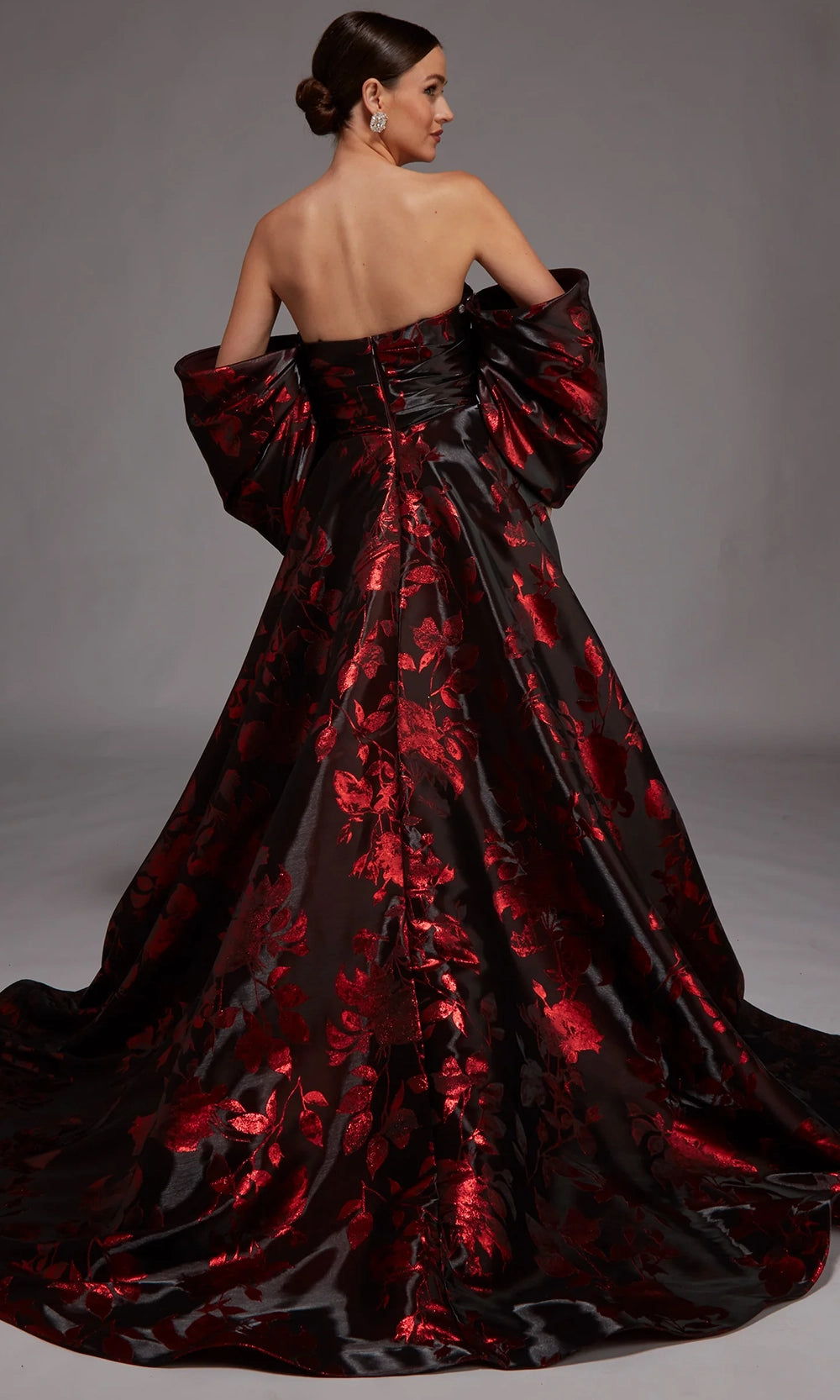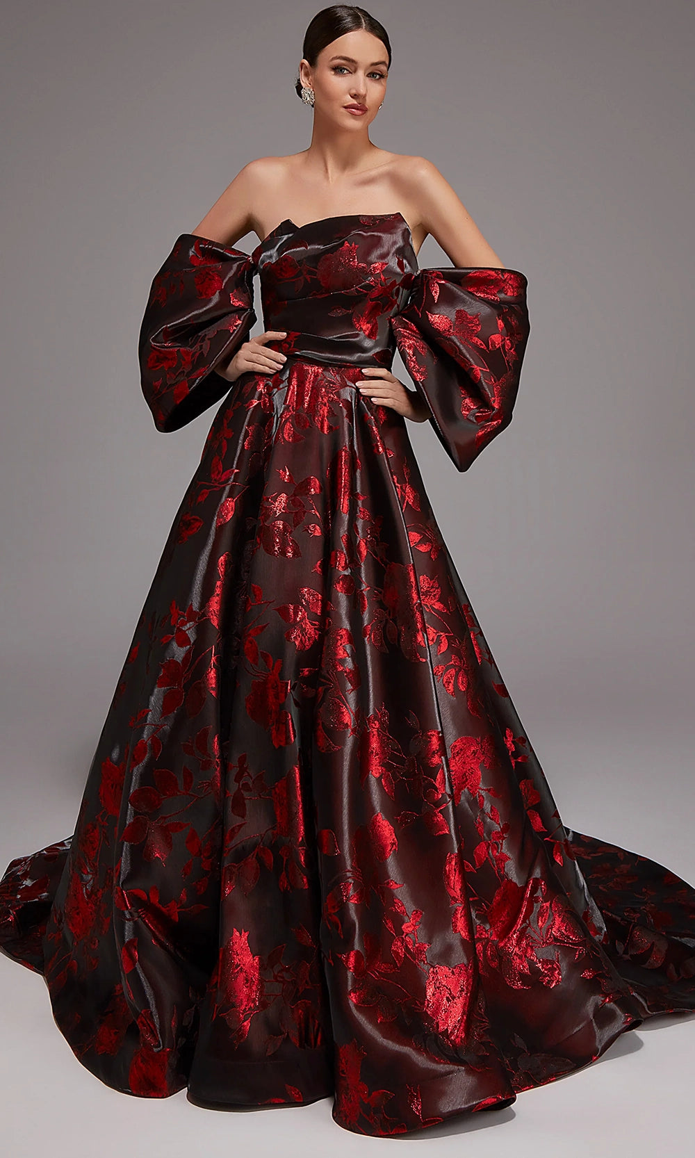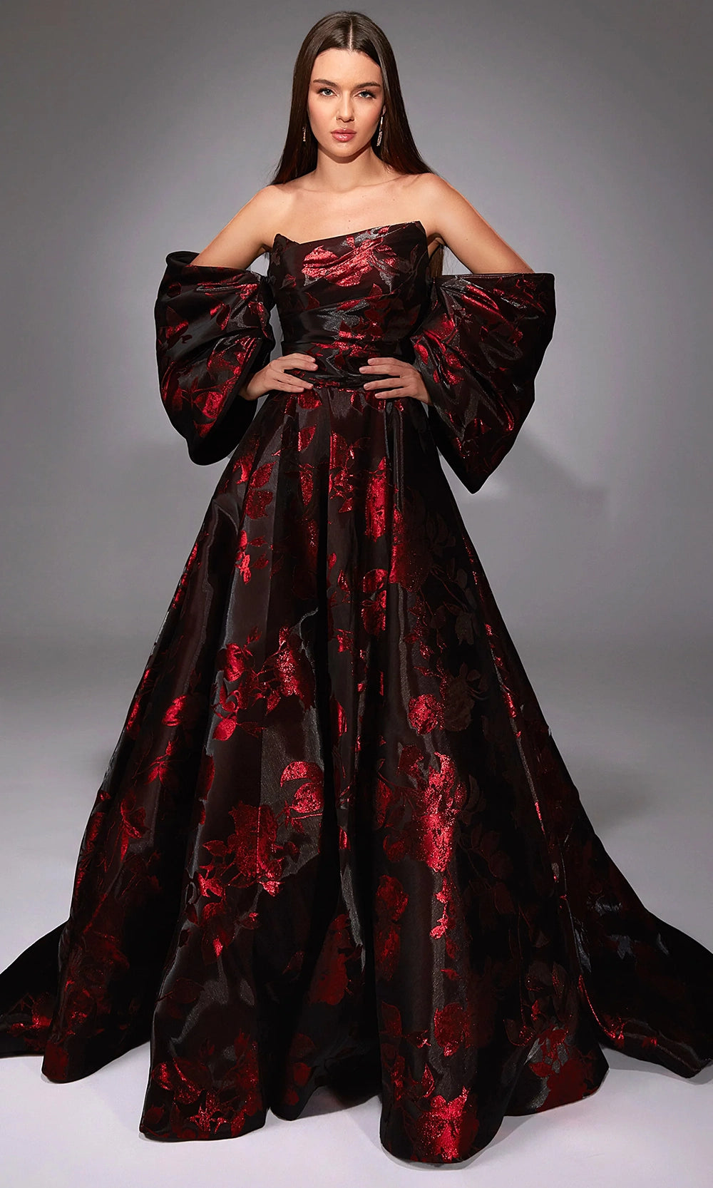 Experience couture elegance with this breathtaking Alyce Paris style 27862 creation, designed for those who love statement-making glamour. Its removable oversized sleeves add a dramatic flair, allowing you to transform your look from regal to timeless simplicity. The strapless bodice and sculpted ball gown skirt are beautifully crafted with a textured floral pattern, while the sweeping train brings luxurious movement. Whether worn with or without sleeves, Alyce Paris style 27862 brings sophistication to galas, weddings, and red-carpet events—making it the unforgettable piece you have been searching for. Model is wearing Black-Red color.