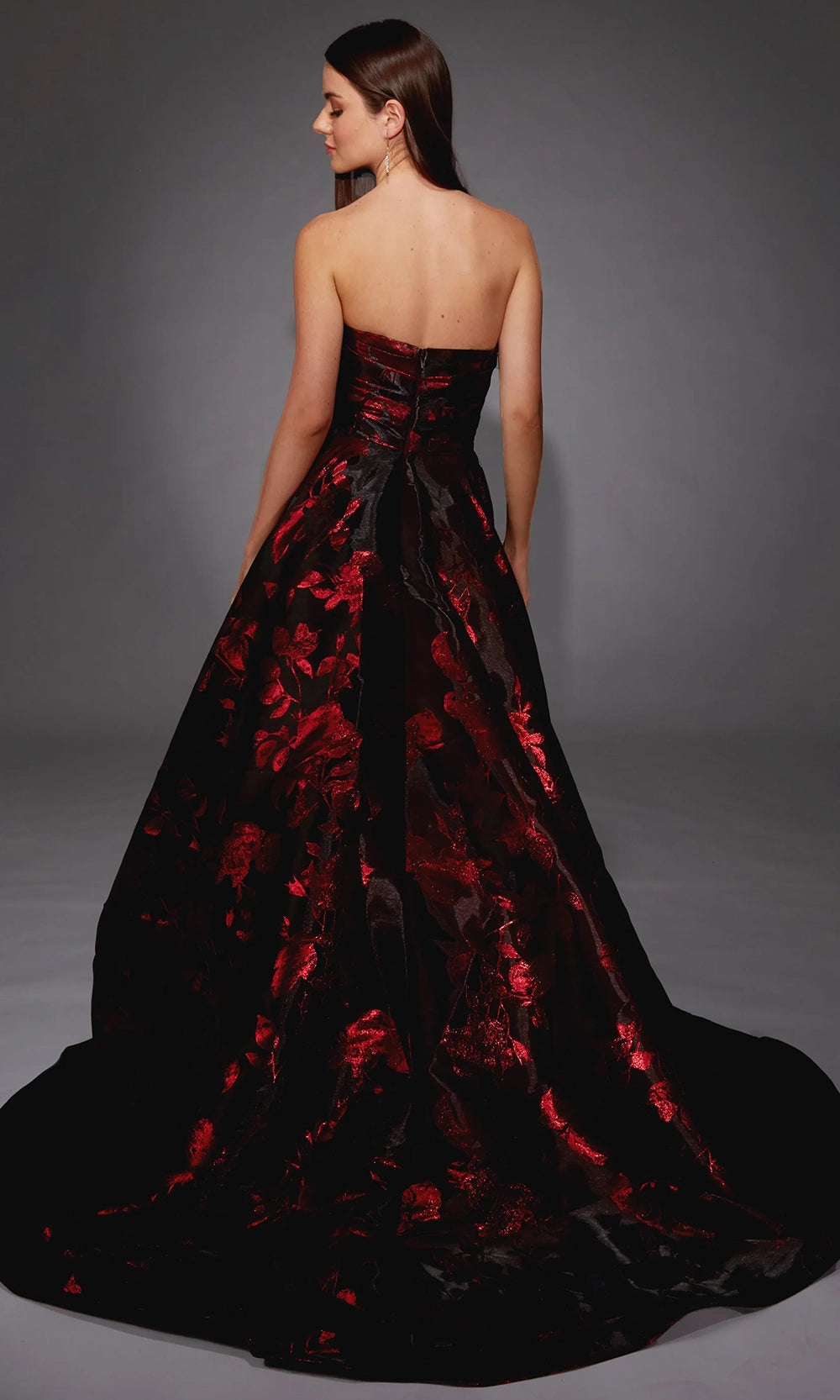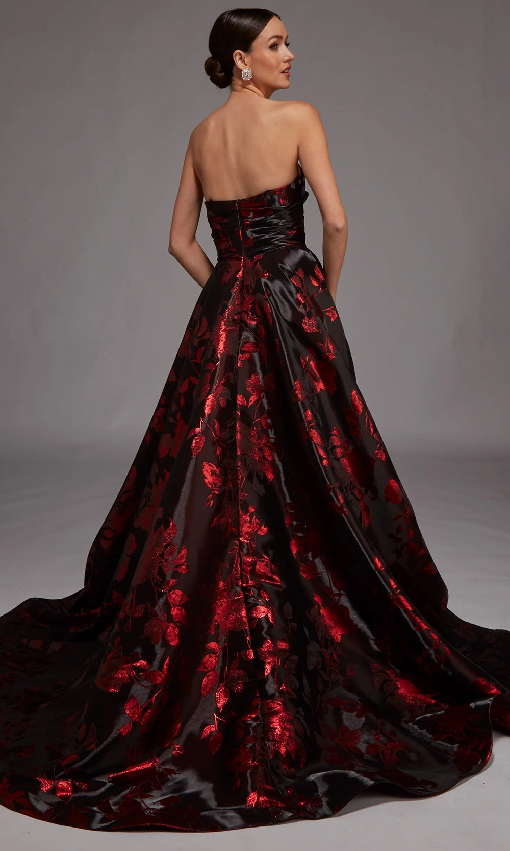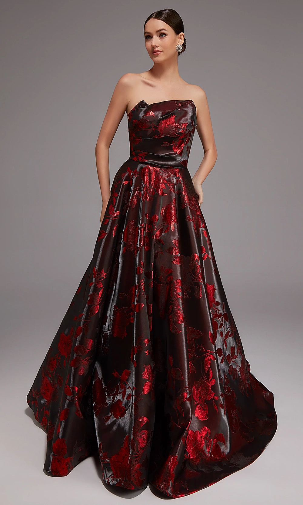 Experience couture elegance with this breathtaking Alyce Paris style 27862 creation, designed for those who love statement-making glamour. Its removable oversized sleeves add a dramatic flair, allowing you to transform your look from regal to timeless simplicity. The strapless bodice and sculpted ball gown skirt are beautifully crafted with a textured floral pattern, while the sweeping train brings luxurious movement. Whether worn with or without sleeves, Alyce Paris style 27862 brings sophistication to galas, weddings, and red-carpet events—making it the unforgettable piece you have been searching for. Model is wearing Black-Red color.