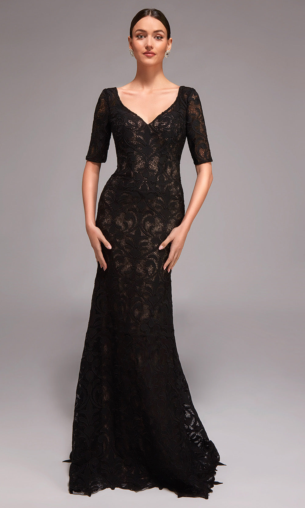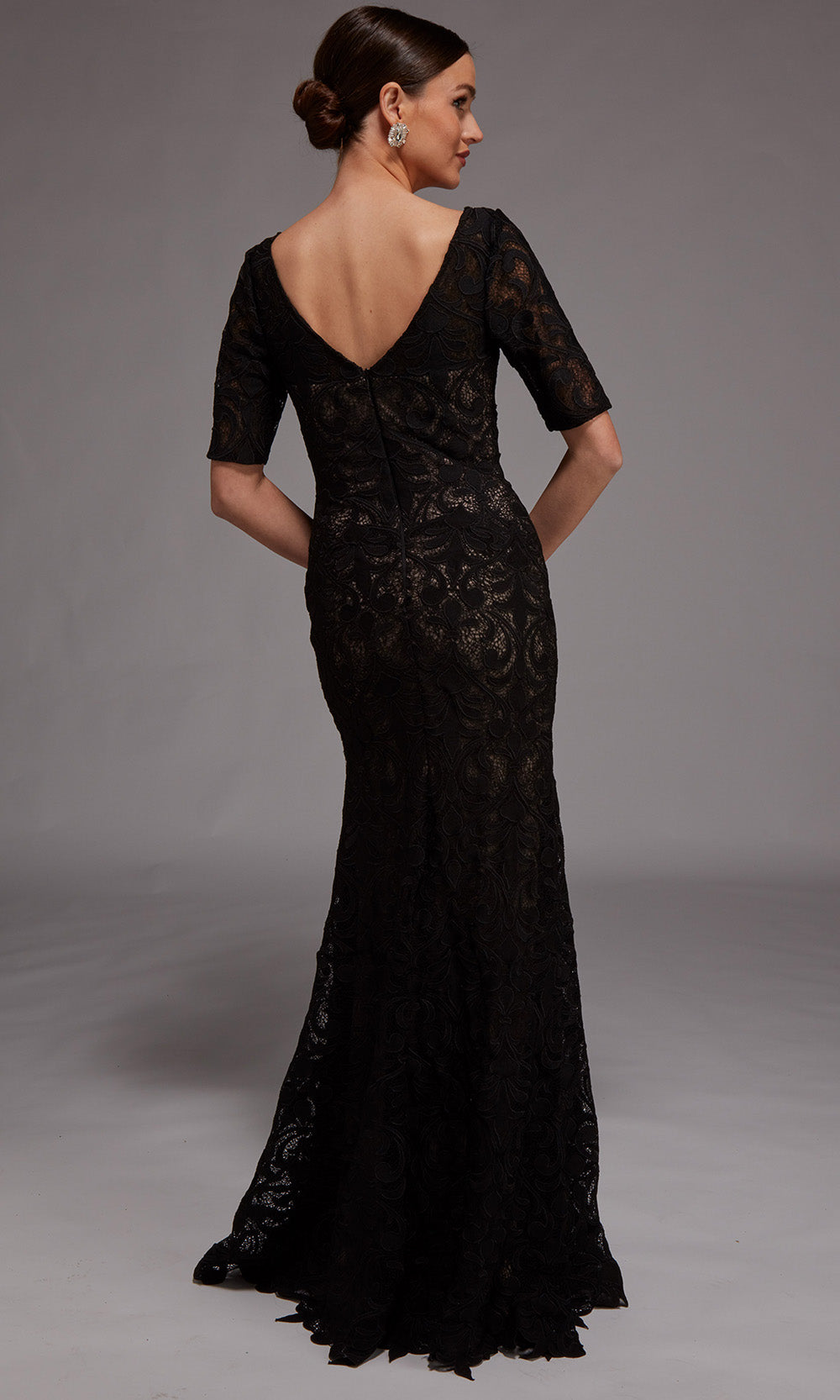 Let every detail of this Alyce Paris 27871 gown cast a graceful charm that turns heads instantly. The full-length gown showcases a v-neckline and graceful short sleeves that complement the delicate lace overlay. The figure-hugging sheath silhouette defines the waist and flows effortlessly to the floor, creating a refined and feminine shape. Floral lace patterns add texture and dimension to the design, making it both striking and sophisticated. Perfect for an upscale gathering or formal occasion, Alyce Paris 27871 elevates classic elegance with contemporary appeal. Model is wearing Black-Shadow Grey color.