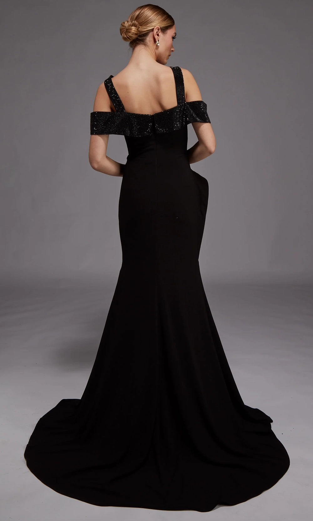 Alyce Paris style 27878 is a refined choice for women who appreciate timeless elegance with a modern twist. This sophisticated gown highlights a graceful sweetheart neckline paired with unique cold shoulder straps adorned with subtle beaded accents, adding a touch of sparkle without overwhelming the design. The sleek fitted bodice flows smoothly into a soft sweep train, creating a flattering and elongating effect. A polished side draped detail introduces dimension and couture styling, elevating the look further. Perfect for formal affairs, galas, or evenings of celebration, Alyce Paris style 27878 invites you to step into sophistication with a gown designed to leave a lasting impression. Model is wearing Black color.