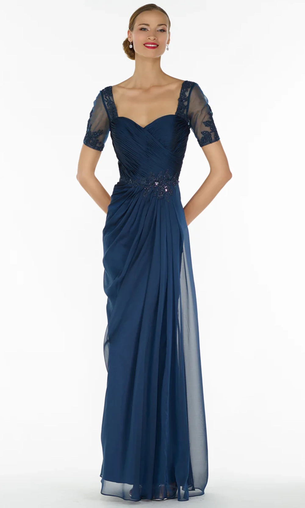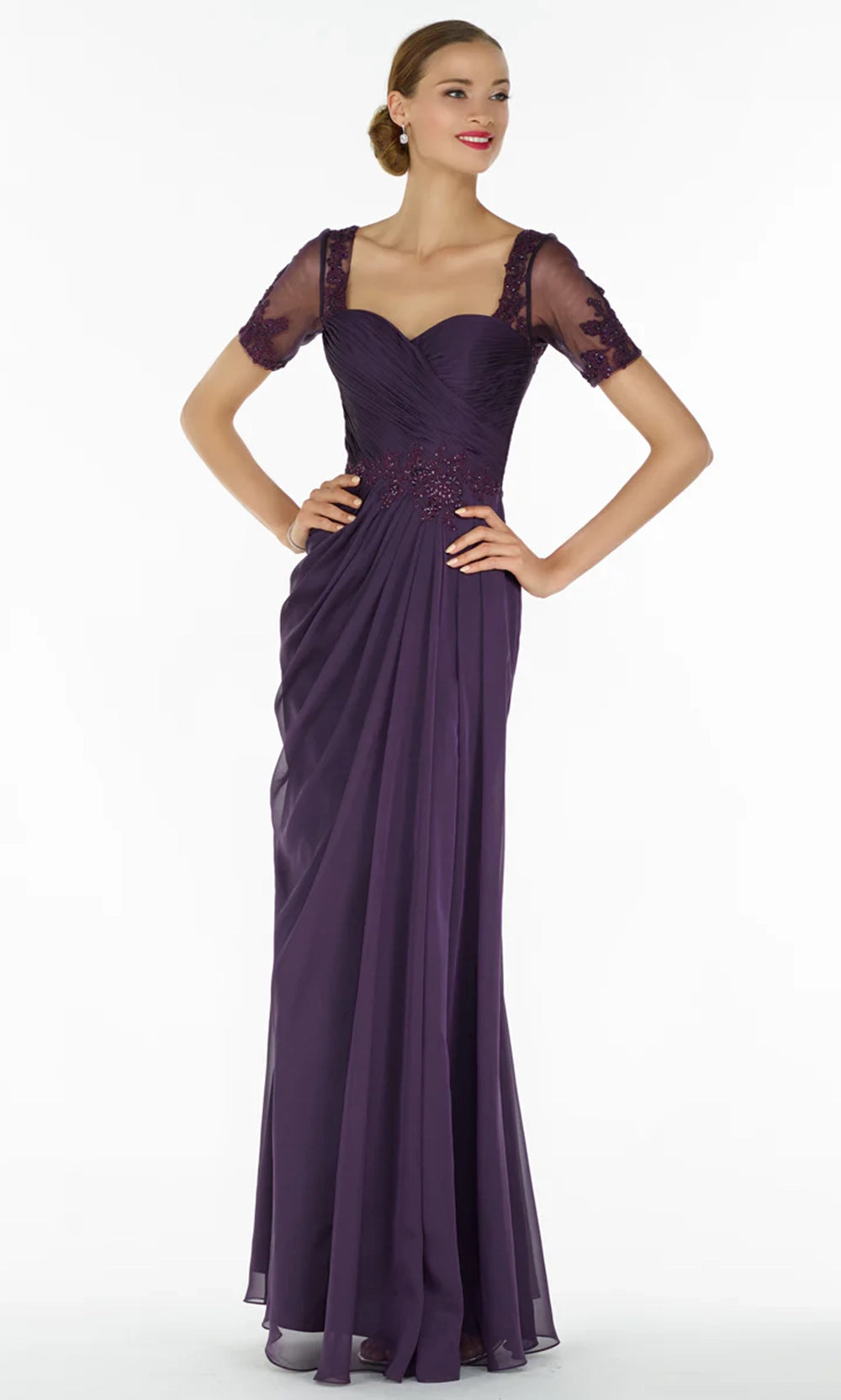 Classic elegance is beautifully expressed in the Alyce Paris 29580 dress, a refined choice for formal or any occasions. This design features a ruched bodice with beaded lace appliques and a romantic sweetheart neckline framed by illusion short sleeves. The natural waist is softly gathered and flows into a full chiffon sheath skirt that adds movement and lightness. Combining structure with softness, this ensemble brings graceful charm to any celebration. Alyce Paris 29580 is the perfect harmony of sophisticated detail and timeless beauty. Models are wearing Blue Coral, Seabreeze, and Amethyst colors.