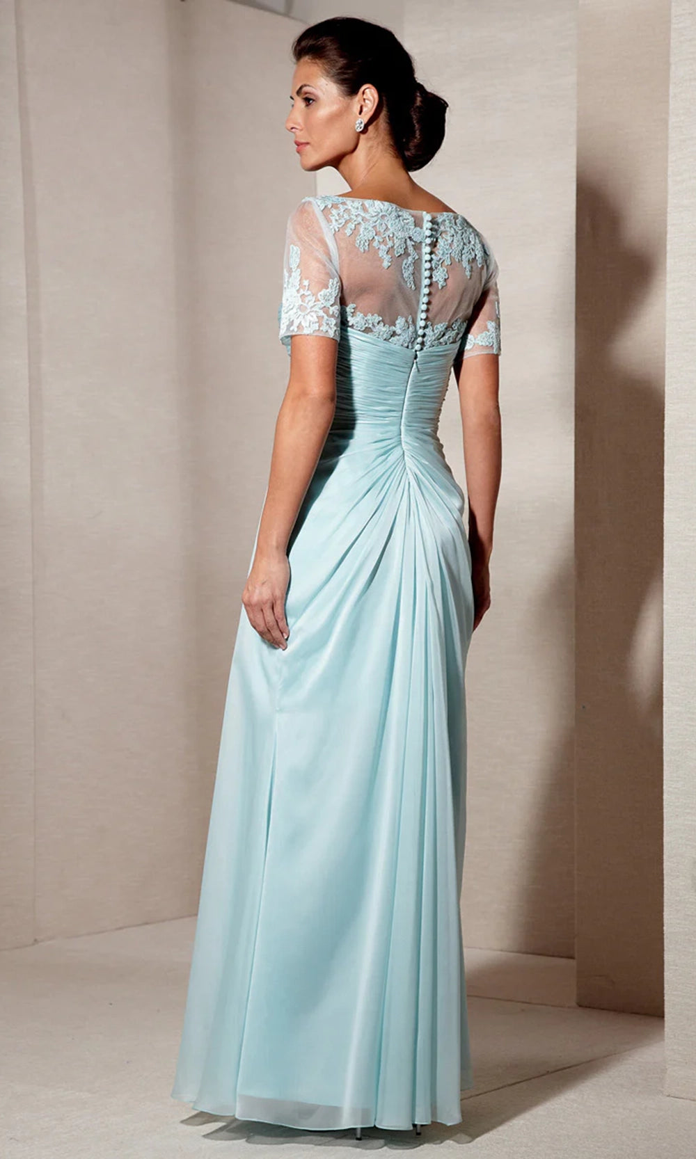| Details: | Illusion Short Sleeves, Ruched, Beaded Lace Appliques, Draped Skirt, Illusion Back, Buttons Closure |