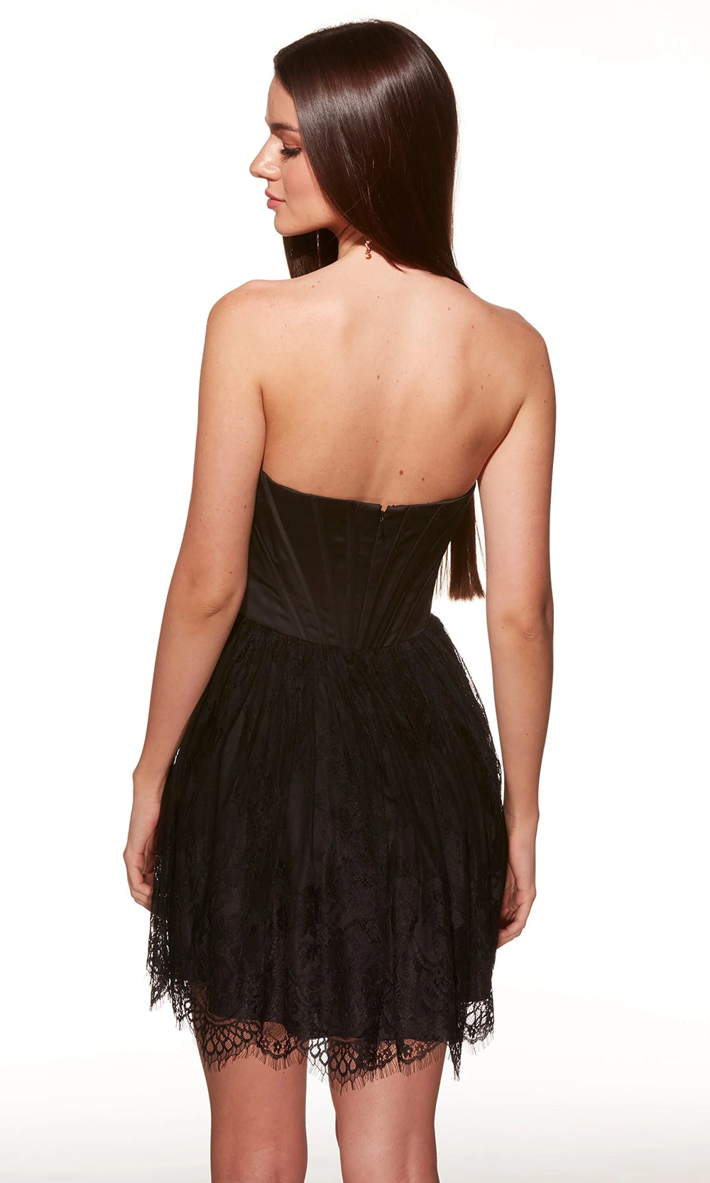 Alyce Paris Style 30011 brings a fresh and feminine statement to your special event wardrobe. This dress features a structured strapless corset bodice with defined bust cups and elegant pearl-trim accents that add a soft touch of sparkle. The lace A-line skirt flows beautifully with delicate movement, while the scalloped hem creates a romantic finish. With its flattering silhouette and charming details, Alyce Paris Style 30011 is the perfect choice for parties, celebrations, and unforgettable moments. Model is wearing Black and Pink colors.