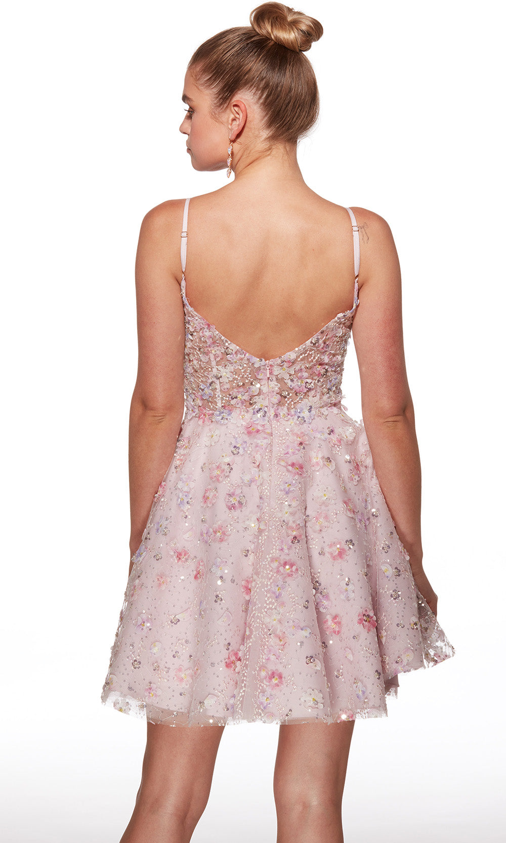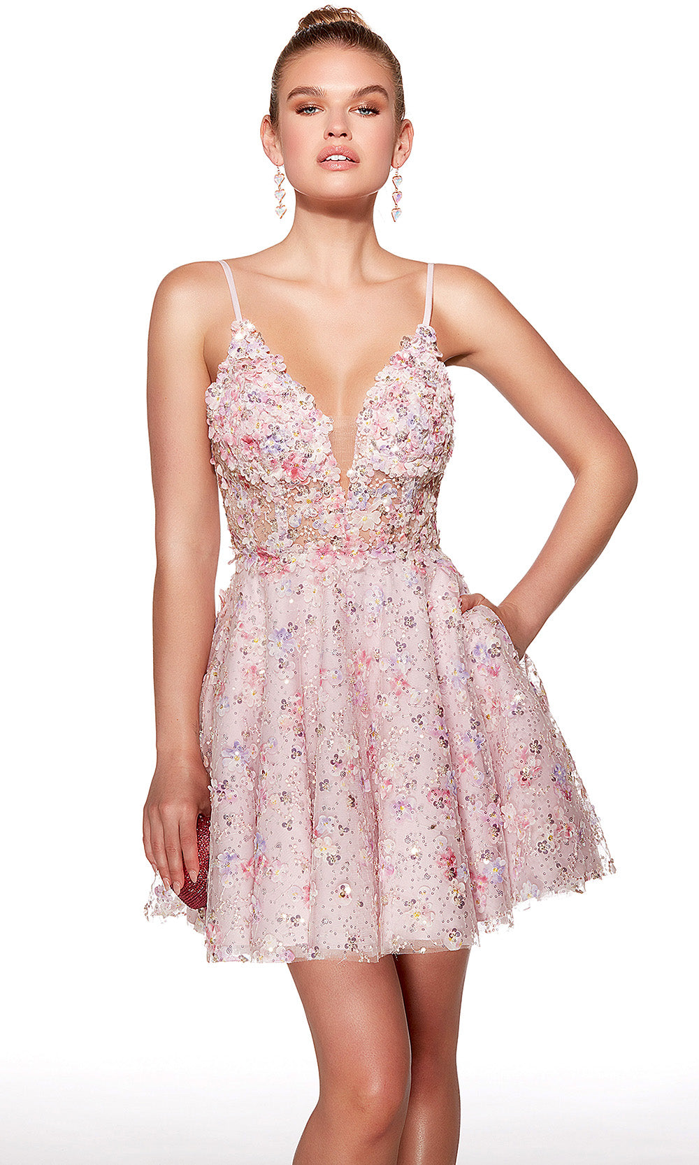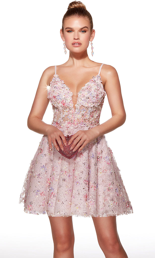 Celebrate your femininity with charm and sparkle in Alyce Paris 30017, a sleeveless dress that radiates romance from every detail. The plunging V-neckline and v-open back creates a striking focal point, framed by adjustable spaghetti straps. Three-dimensional floral and sequin embellishments enhance the bodice for a captivating touch, while the A-line skirt adds vibrant energy and volume. Whether it is a special evening or unforgettable celebration, Alyce Paris 30017 style is a radiant choice for standing out beautifully. Model is wearing Pink color.