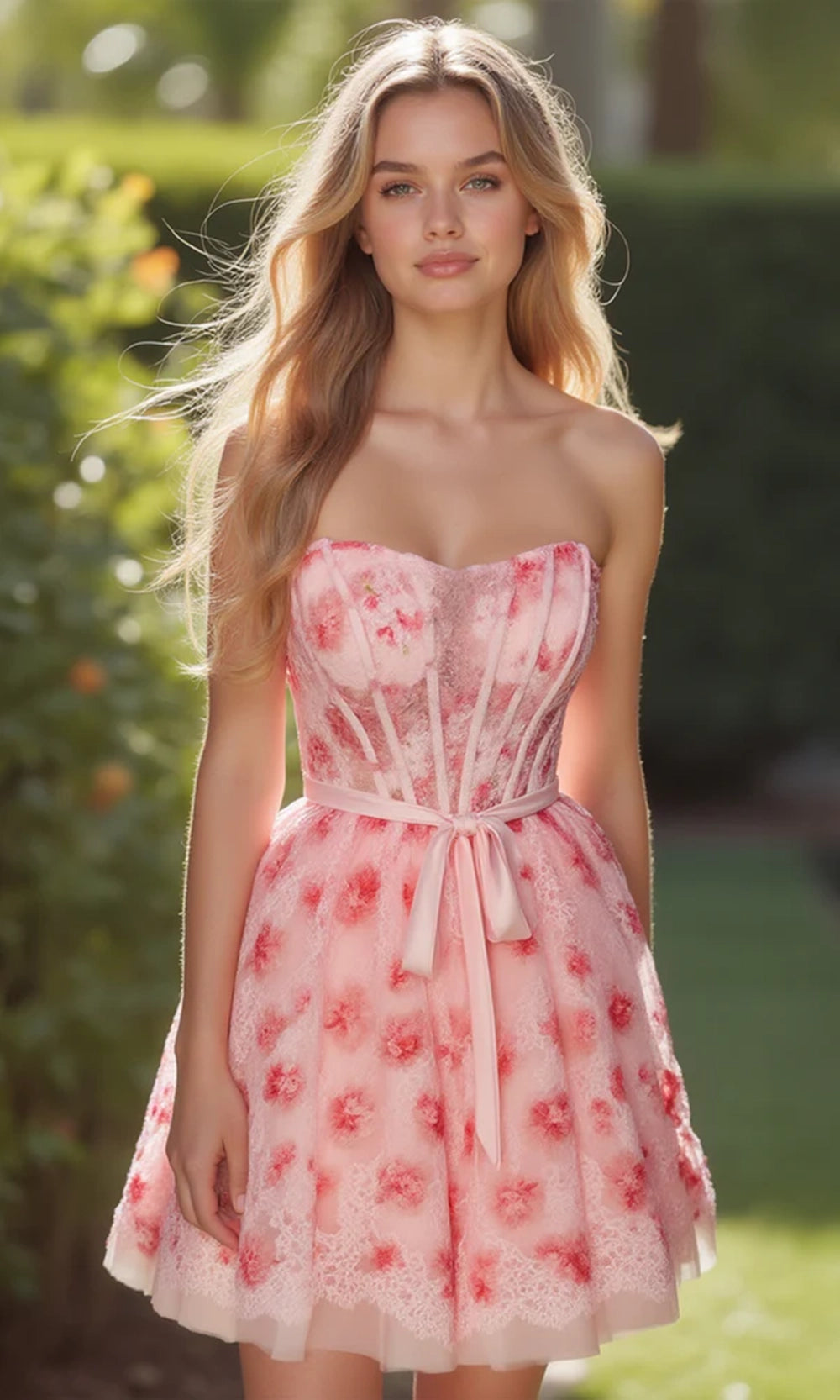 | Details: | Strapless bodice, structured corset design, lace floral-overlay skirt, satin bow waist accent, A-line mini silhouette |