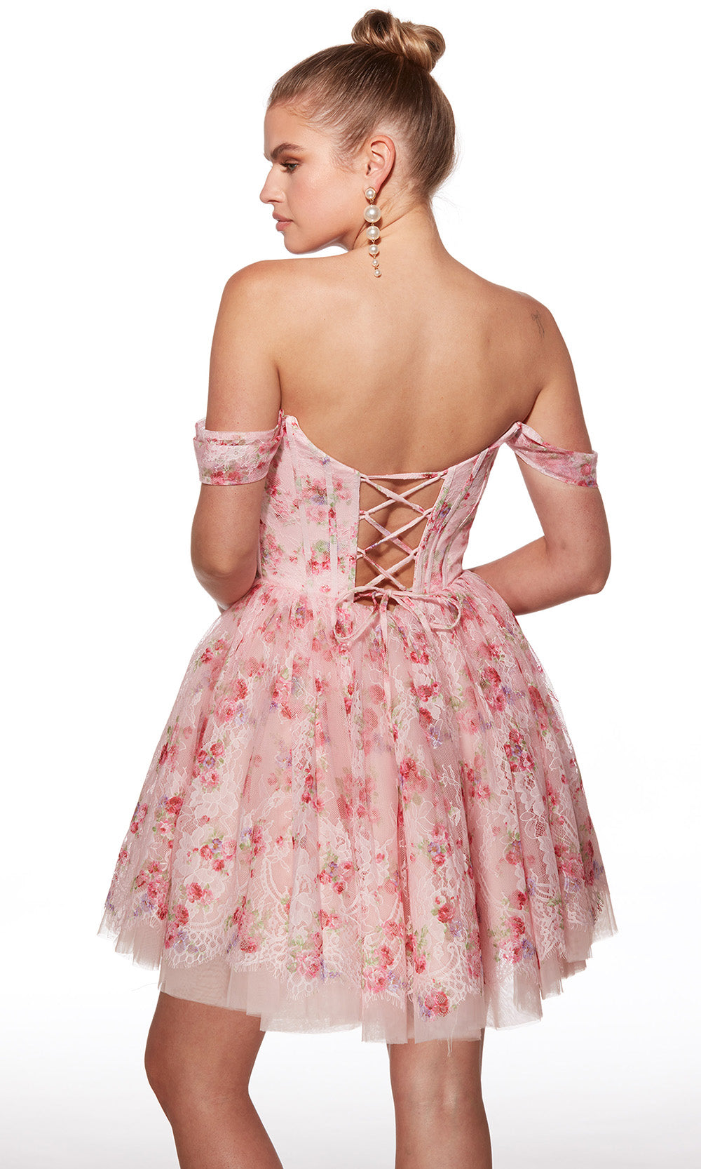 Choose this Alyce Paris 30021 dress for a special occasion where grace and charm are key. It combines the elegance of floral lace with the structure of a corset-style bodice, creating a charmingly feminine short dress. The off shoulder sleeves and straight across neckline showcases the shoulders, while the Basque waist transitions into a soft, flared A-line skirt that flatters every figure. The floral print lace overlay is rich in texture and brings a romantic vintage vibe to the silhouette. From its romantic styling to its beautifully tailored fit, Alyce Paris 30021 is a must-have for any wardrobe. Model is wearing Pink color.