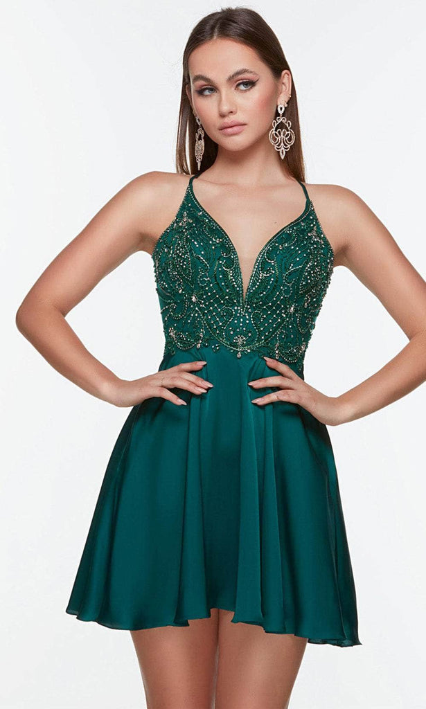 Dance the night away in this majestic Alyce Paris 3112 cocktail dress. The alluring sleeveless dress displays a beaded embellished top framed with a plunging V-neckline. A dual spaghetti strap fall along the open back creating an amazing strappy design and it also displays a cutout detail with zipper closure at the lower back. The flowy satin skirt gracefully cascades down to a short A-line silhouette. This Alyce Paris creation will definitely make a statement in every occasion. Models are wearing the Pine and Wine colors.