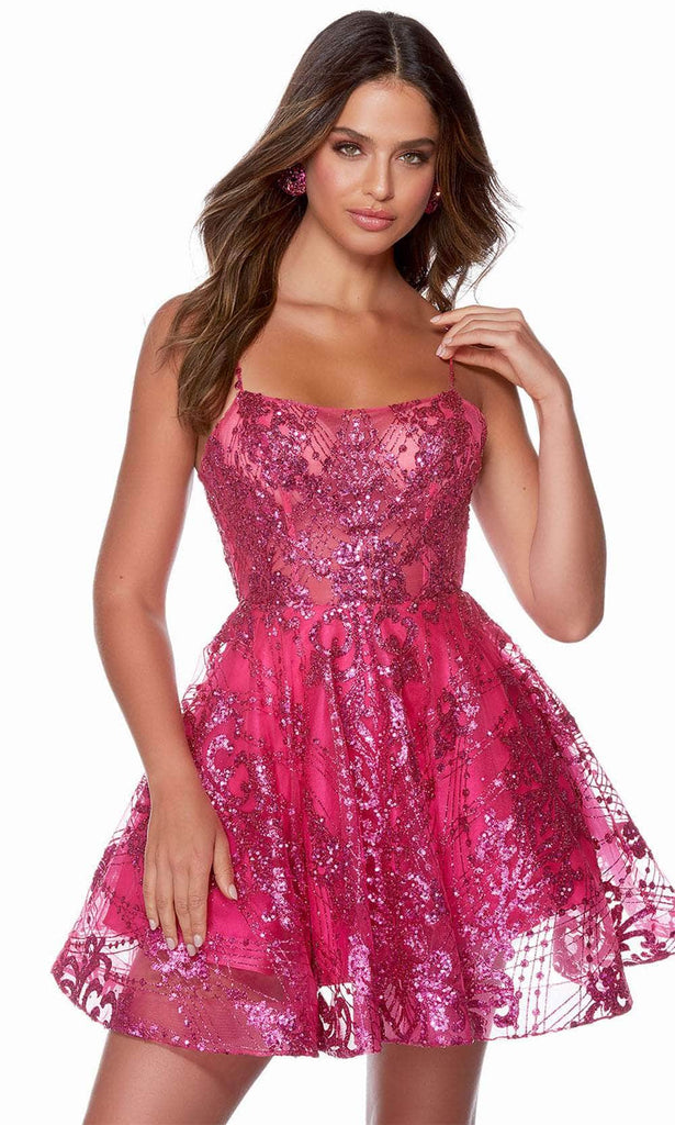 Make your presence known as you enter the scene wearing this fabulous Alyce Paris 3122 creation. Parading an intricate display of glittering designs allover its length, this piece flaunts a sheer bodice with spaghetti straps and a scoop neckline. The scintillating dress reveals a lace up bandeau detail while revealing an open design at the small of the back. The skirt flutters into an A-line silhouette with a mini hemline. Infuse your special event with stellar style in this Alyce Paris 3122 masterpiece. Models are wearing the Raspberry and Pink Alabaster colors.