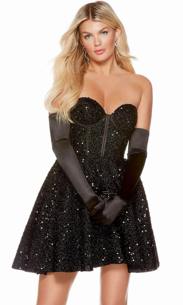 Step into the spotlight with Alyce Paris 3175, a breathtaking dress that embodies timeless beauty. The strapless corset bodice is a vision of sophistication, boasting a sweetheart neckline that flatters the décolletage. The lace-up back adds a touch of allure and allows for a customizable fit. A back zipper closure ensures ease of wear. The short-length A-line silhouette skirt completes the ensemble with elegance. This Alyce Paris 3175 makes a lasting impression. Model is wearing Black color.