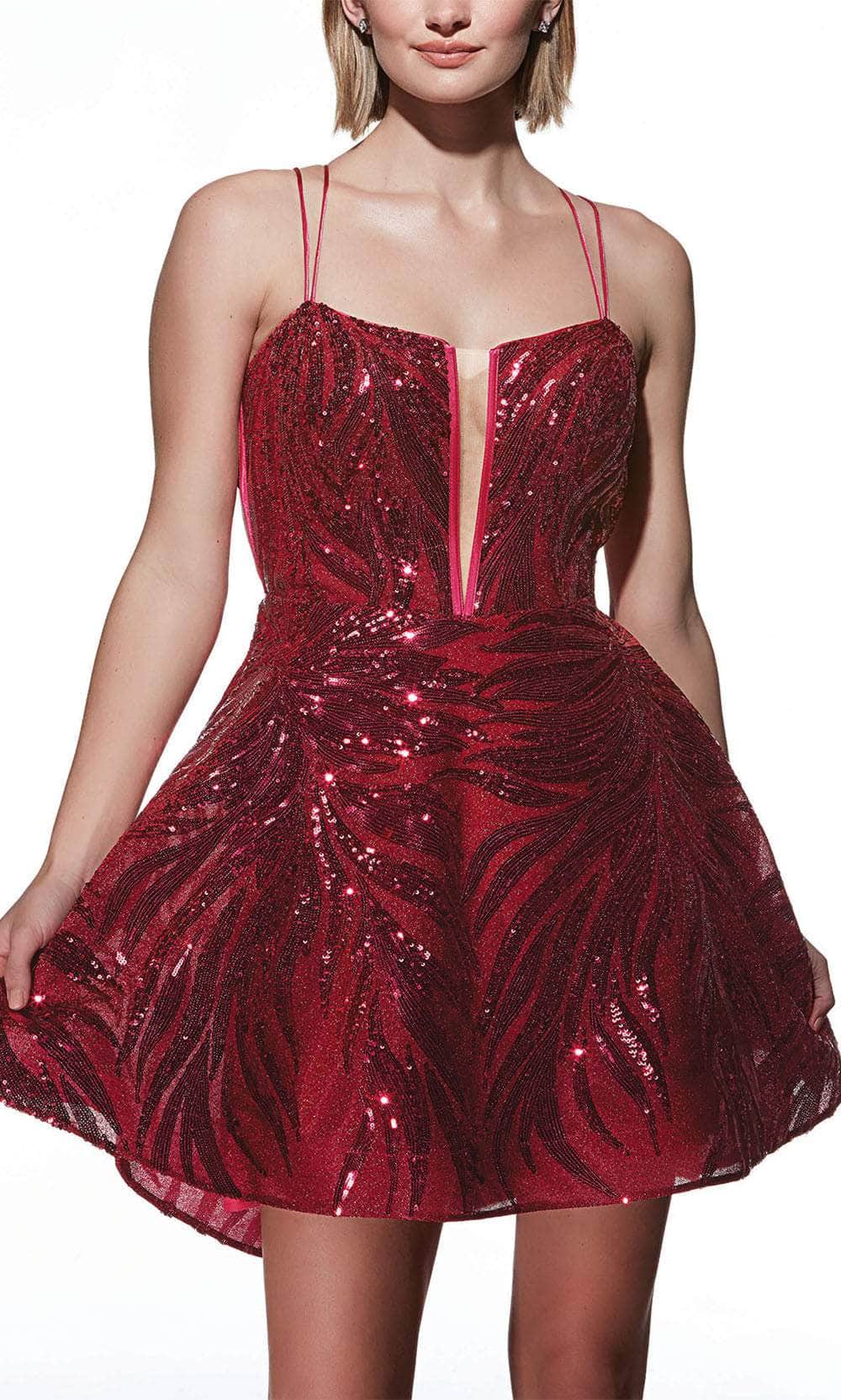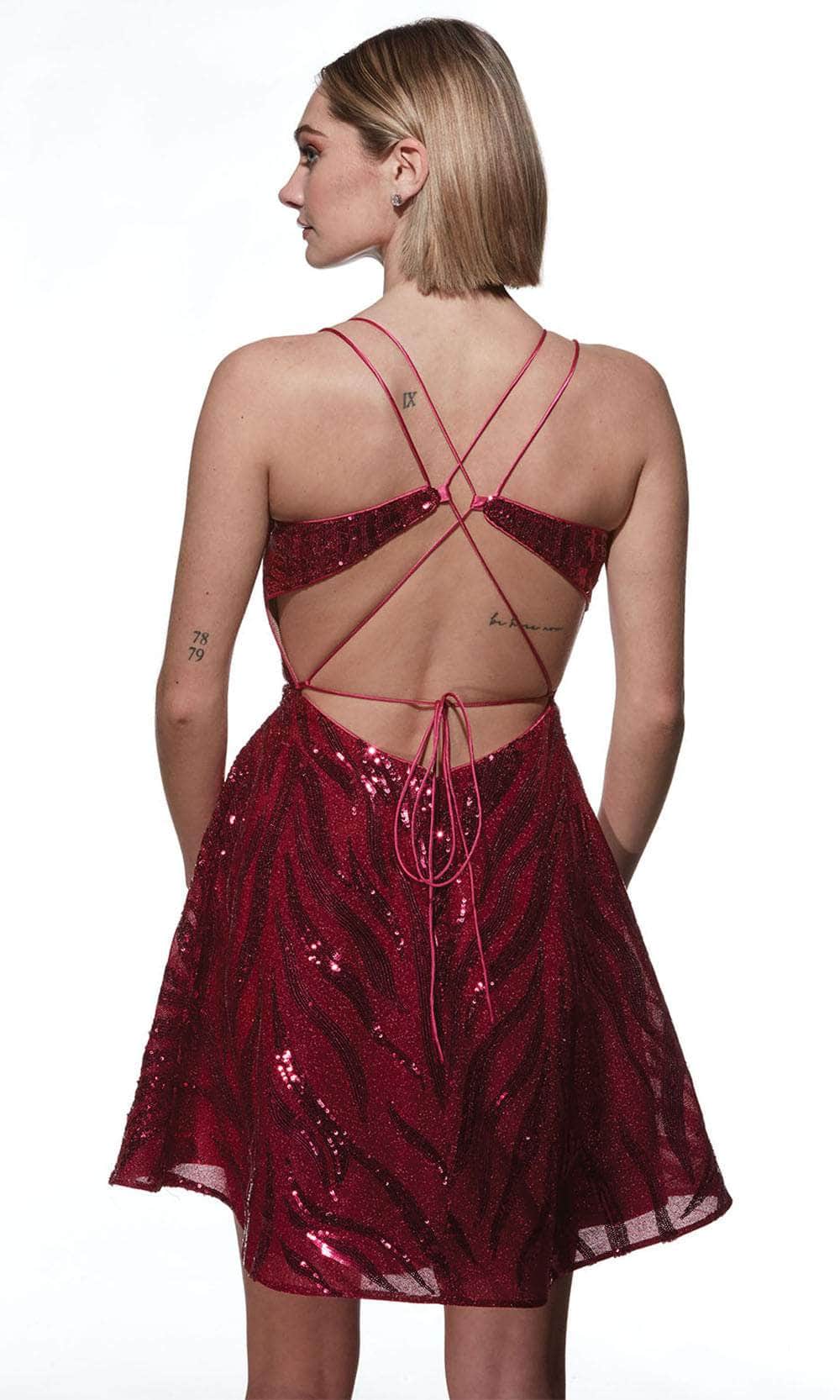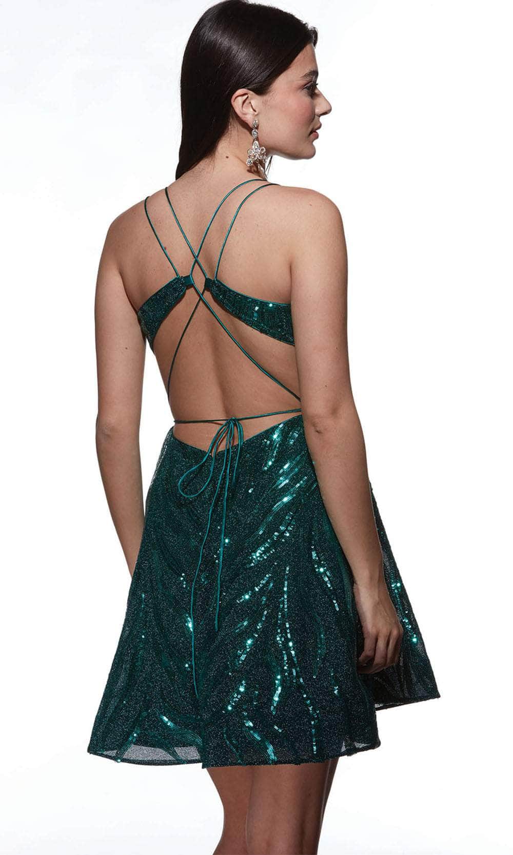 Embrace your inner sparkle with this stunning sequin-embellished Alyce Paris 3783 masterpiece. Designed with a sleeveless bodice and a daring plunging V-neckline with a sheer insert, this dress exudes both elegance and boldness. The back features an alluring bandeau design with crisscross straps and delicate strappy details that add a modern, eye-catching twist. A concealed zipper ensures a flawless fit, while the short A-line silhouette skirt adds a playful finish. Perfect for any special occasion, this Alyce Paris 3783 will make you shine with confidence. Models are wearing Cerise and Everglade colors.