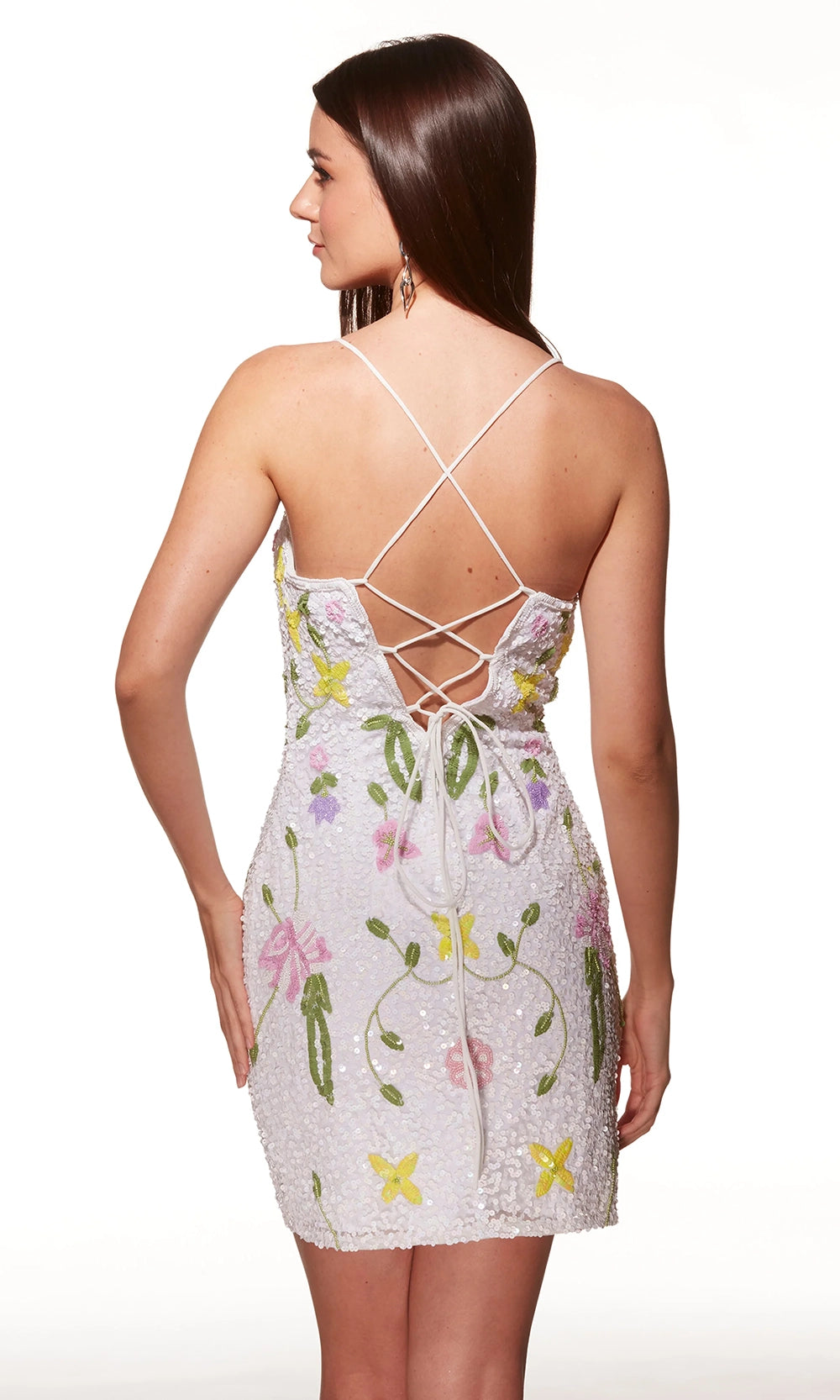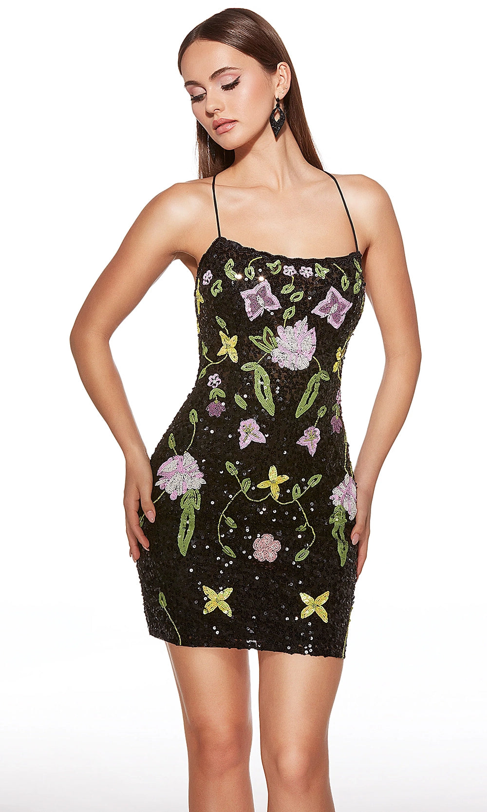 Alyce Paris Style 40061 brings flirty glamour to life with a beautifully beaded short dress designed to command attention. Its fitted silhouette sparkles with sequins and floral beading, while delicate spaghetti straps frame the neckline for a feminine finish. A lace up back adds a stylish twist and allows for a customized fit. Perfect for parties, homecoming, or a night out, Alyce Paris Style 40061 is your chic ticket to looking unforgettable. Model is wearing Black-Multi and Ivory-Multi colors.