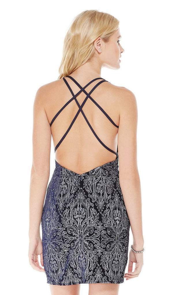 This gorgeous embroidered velvet cocktail dress features a sleeveless frame, plunging V-neckline with sheer inset, fitted bodice and a strappy open back. The dress is secured through back zipper closure and finishes at mid-thigh length.