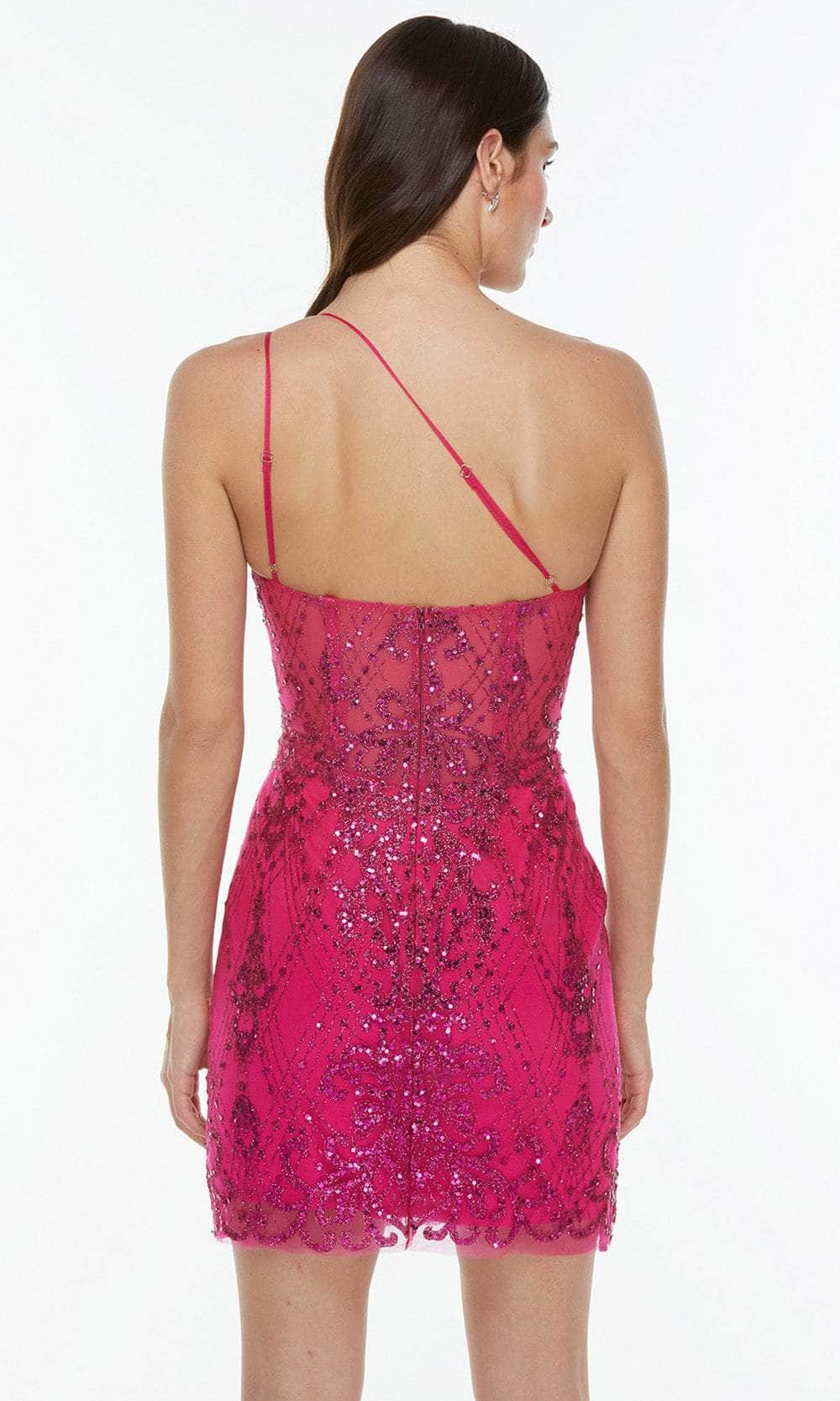 You are more than gorgeous when you wear this unbeatable creation from Alyce Paris 4514. Strikingly tailored in glitter tulle fabric accented with sparkling sequins, the fitted dress is sure to catch everyone's eye. It reveals a sheer top bodice framed with an asymmetric neckline, mid-open back and supported by dual adjustable straps. The skirt softly flows into a short length sheath silhouette. Flaunt your figure in this fabulous short dress by Alyce Paris. Models are wearing the Navy, Pine and Raspberry colors.