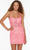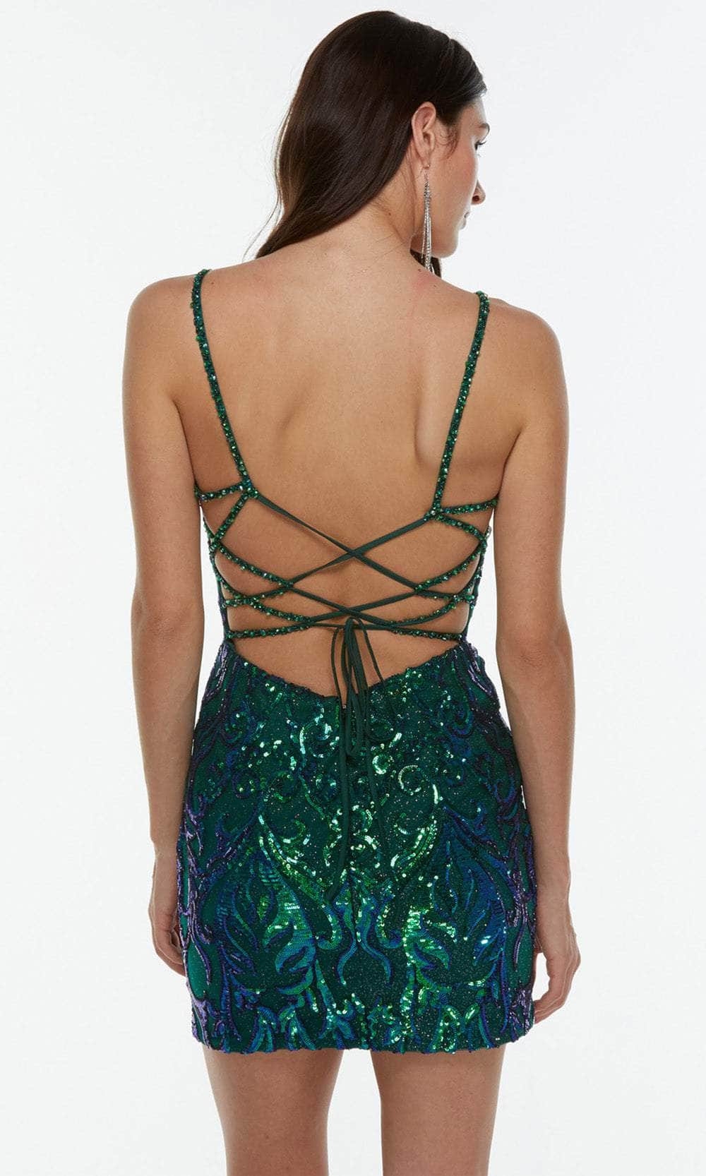 Flaunt your best assets in a scintillating cocktail dress from Alyce Paris 4534. Embellished with Iridescent sequin all over the fitted silhouette, this sleeveless dress displays a sheer corset bodice with a scoop neckline and has beaded thin straps for support. The sexy open back showcases a strappy lace-up tie and zipper closure at the end. The sheath skirt glides elegantly down to a short hemline. This Alyce Paris creation is sure to create a striking look that is sure to make anyone remember your grand entrance. Models are wearing the Cobalt, Neon Pink, Opal, Opal/Lite Blue and Pine colors.