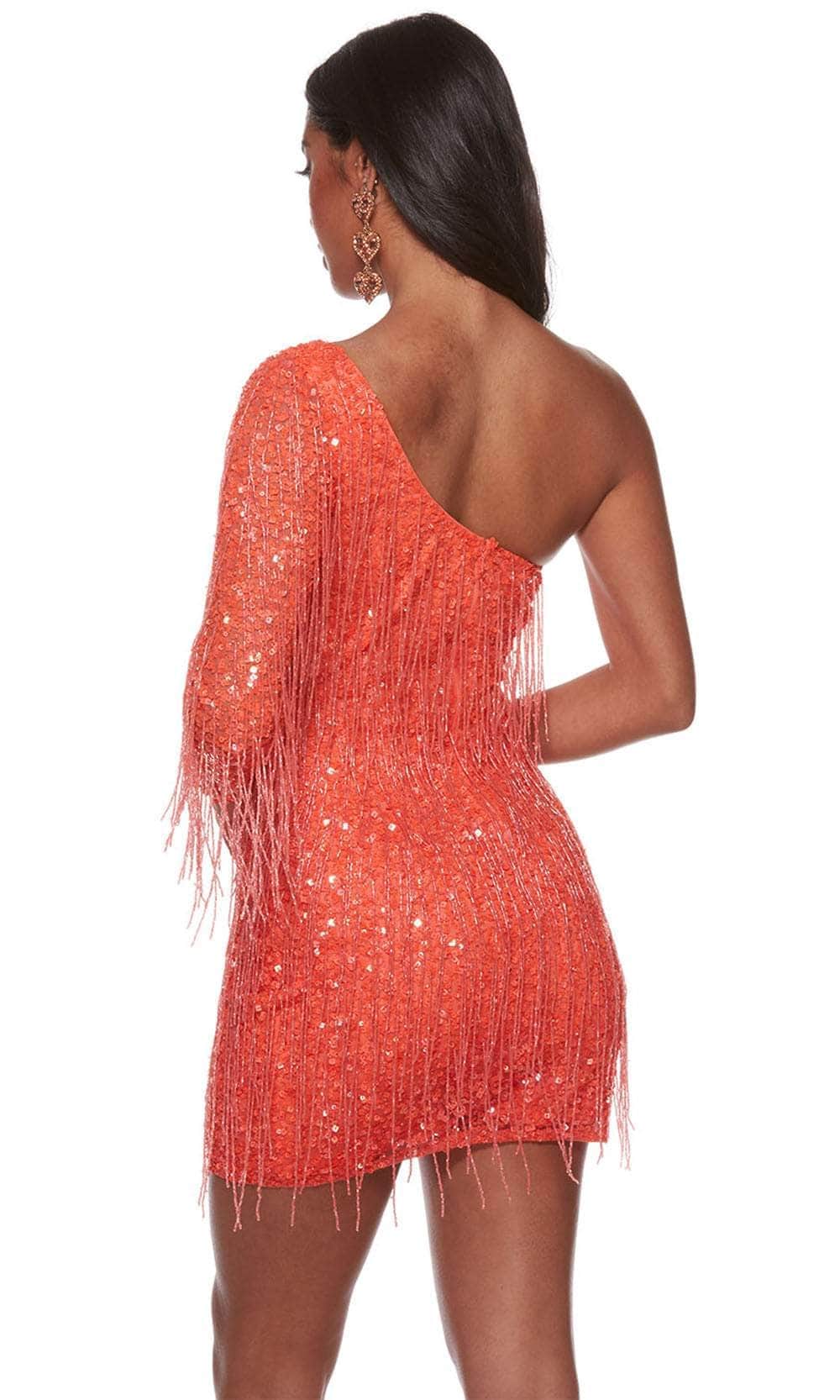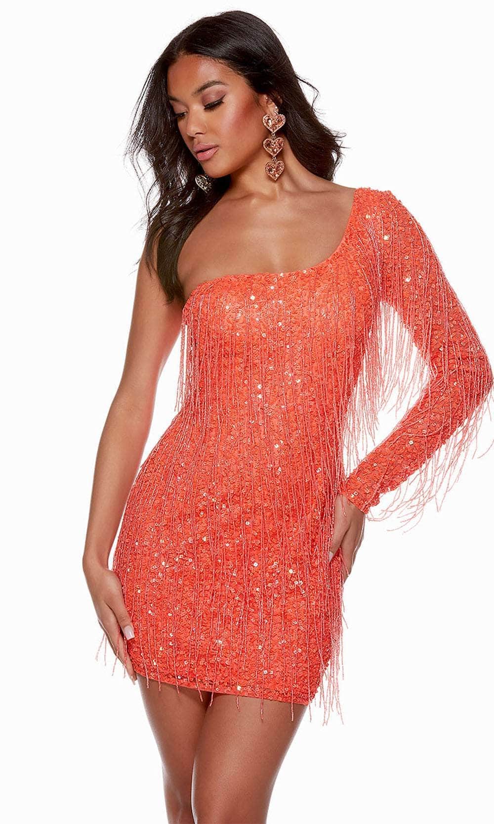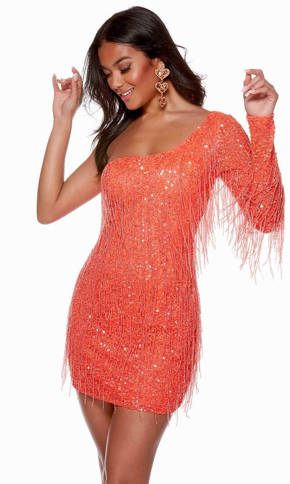 Make your entrance to the party with poise and beauty in this masterpiece from Alyce Paris 4646. This one shoulder dress is expertly fitted to sculpt the feminine shape and adorned completely in glimmering sequin. The beaded fringes sway as you walk and add a dramatic touch. It includes an asymmetric neckline reflected by the partial open back, and a single long illusion sleeve. The skirt hits the short hemline and forms a flattering sheath silhouette. Get noticed in this glowing dress from Alyce Paris 4646. Models are wearing Blue Iris, Caribbean, and Hot Coral colors.