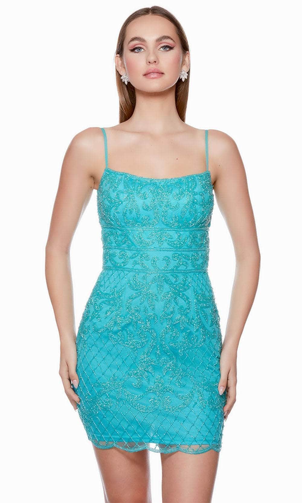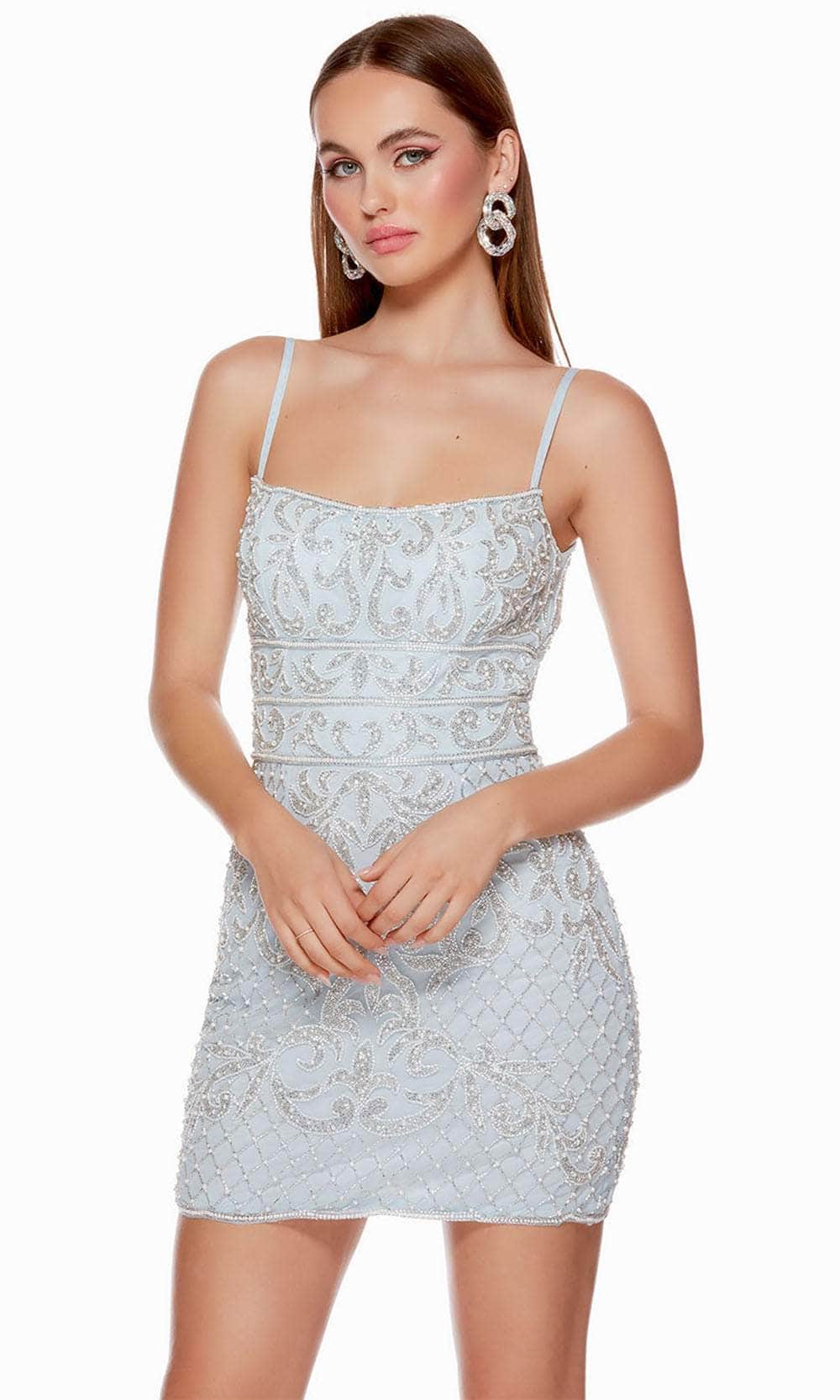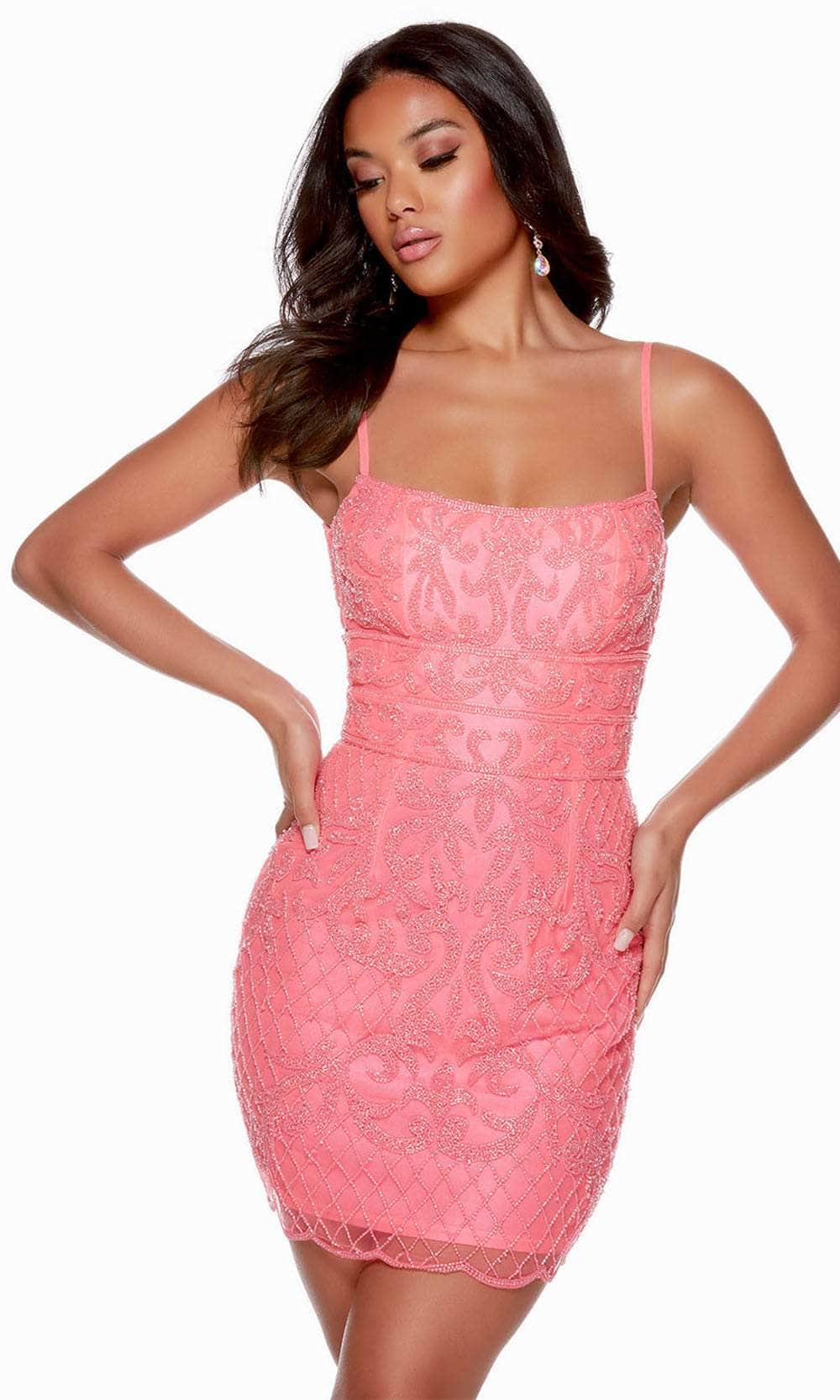 Radiate a sultry and spectacular flair in this cocktail dress from Alyce Paris 4660. Show up in this figure-flattering dress completely adorn with intricate beadwork. This eye-catching style features a sleeveless bodice with a scoop neckline, adjustable thin shoulder straps and a v-shaped open back. A triple beaded thin band on the waist enhances your curves. In addition, the sheath skirt has a lovely illusion scalloped hem and a mid-thigh length. This Alyce Paris 4660 masterpiece is sure to make you the darling of the party! Models are wearing the Blue Iris, Latte, Light Neon Pink, Powder Blue, and Caribbean colors.