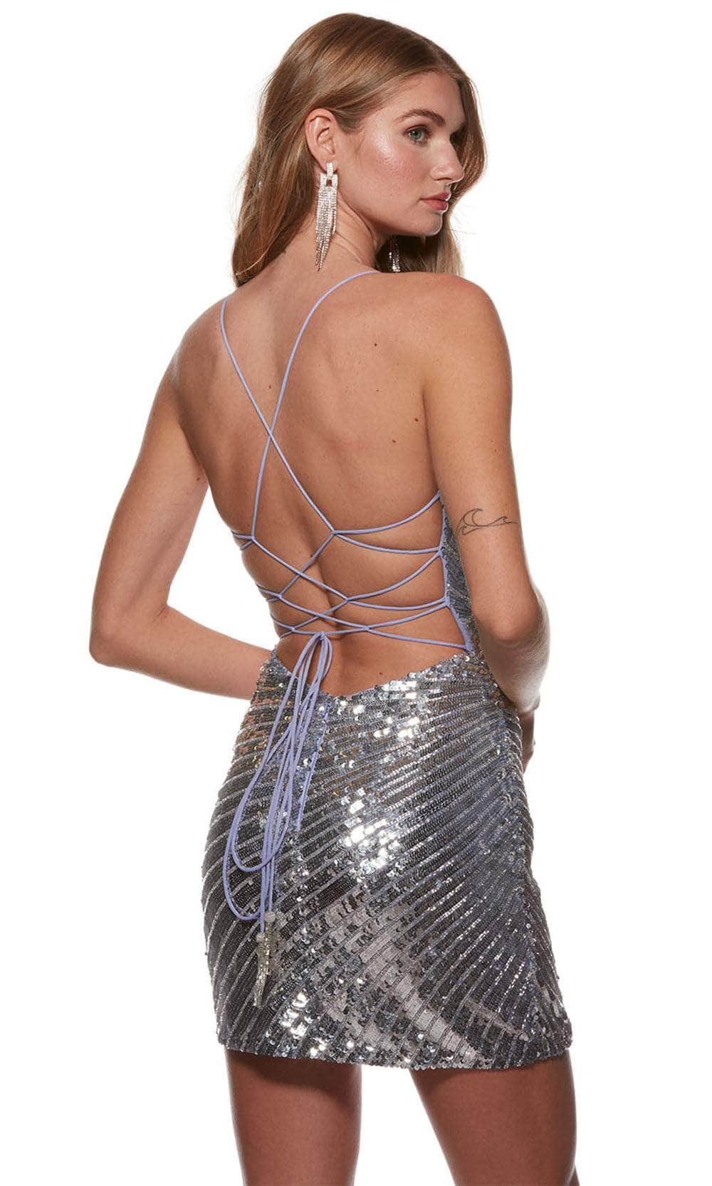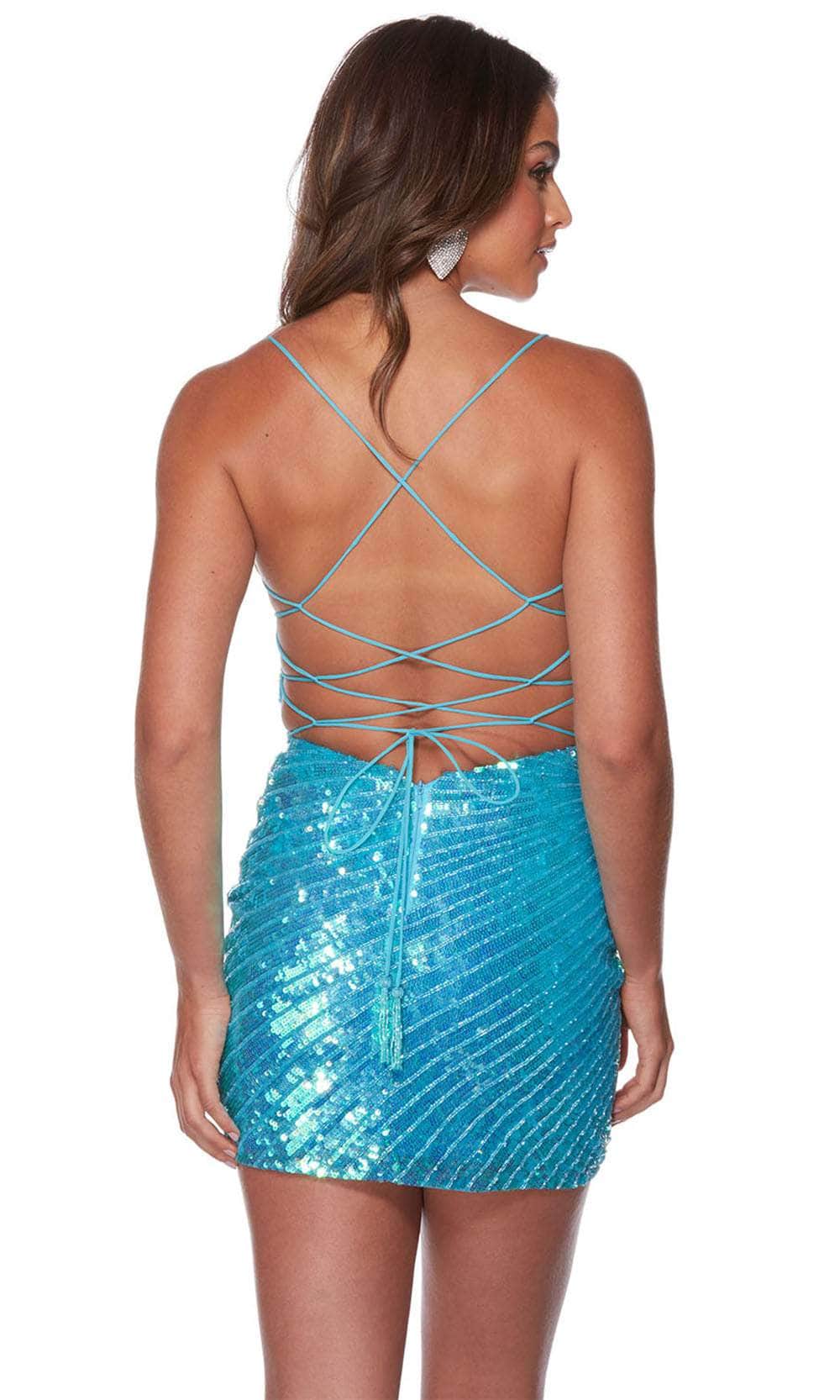 Fall in love with the feminine flair of this cocktail dress by Alyce Paris 4661. Dripping from top to hem with striped sequins and beadings, this outfit shimmers and will catch everyone's attention. It emphasized your hourglass figure and features a deep v-neckline with spaghetti straps. The backless design is daring and has a strappy lace-up closure for a custom fit. Having a sheath silhouette, the skirt finishes in a beautiful mid-thigh hem. Dance and enjoy your next special party or event in this short, sassy and stylish creation by Alyce Paris 4661. Models are wearing the Blue Iris-Silver, Caribbean, and Hyper Pink colors.