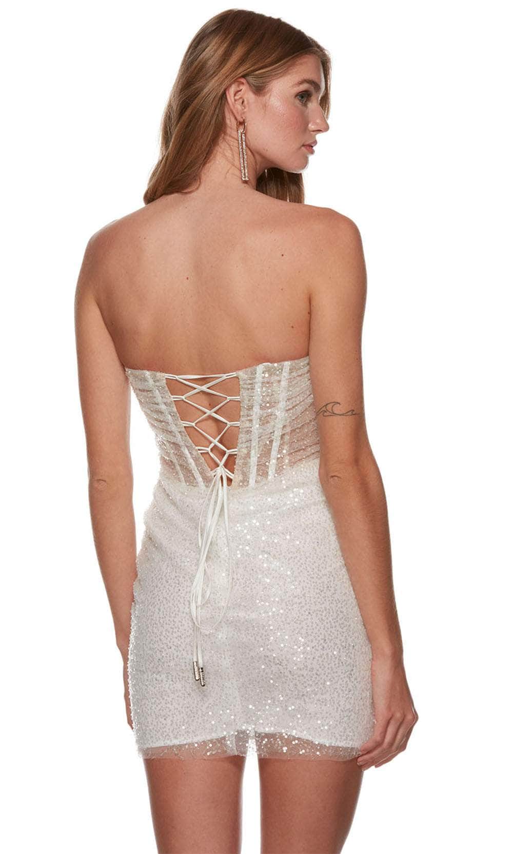 | Details: | Strapless, Ruched, Illusion Corset Bodice, Sequins, Lace-Up Back, Mid-Thigh |