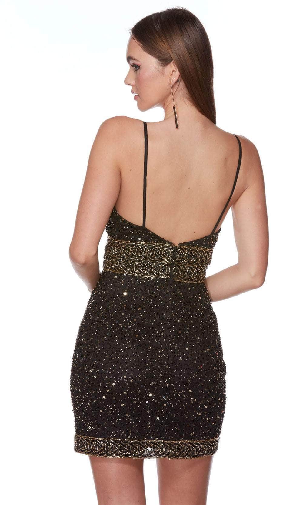 Make your grand entrance in this Alyce Paris 4679. A cocktail dress adorned with sparkling beads and sequins. The sleeveless fitted bodice, boasting a V-neckline supported by delicate spaghetti straps, captures attention with its dazzling details. The mid-rise back adds a touch of allure, while the back zipper closure ensures a seamless fit. The short-length skirt in a sheath silhouette completes this Alyce Paris 4679 with chic sophistication, promising a night of glamour and radiant style that will leave a lasting impression. Model is wearing Black Gold color.