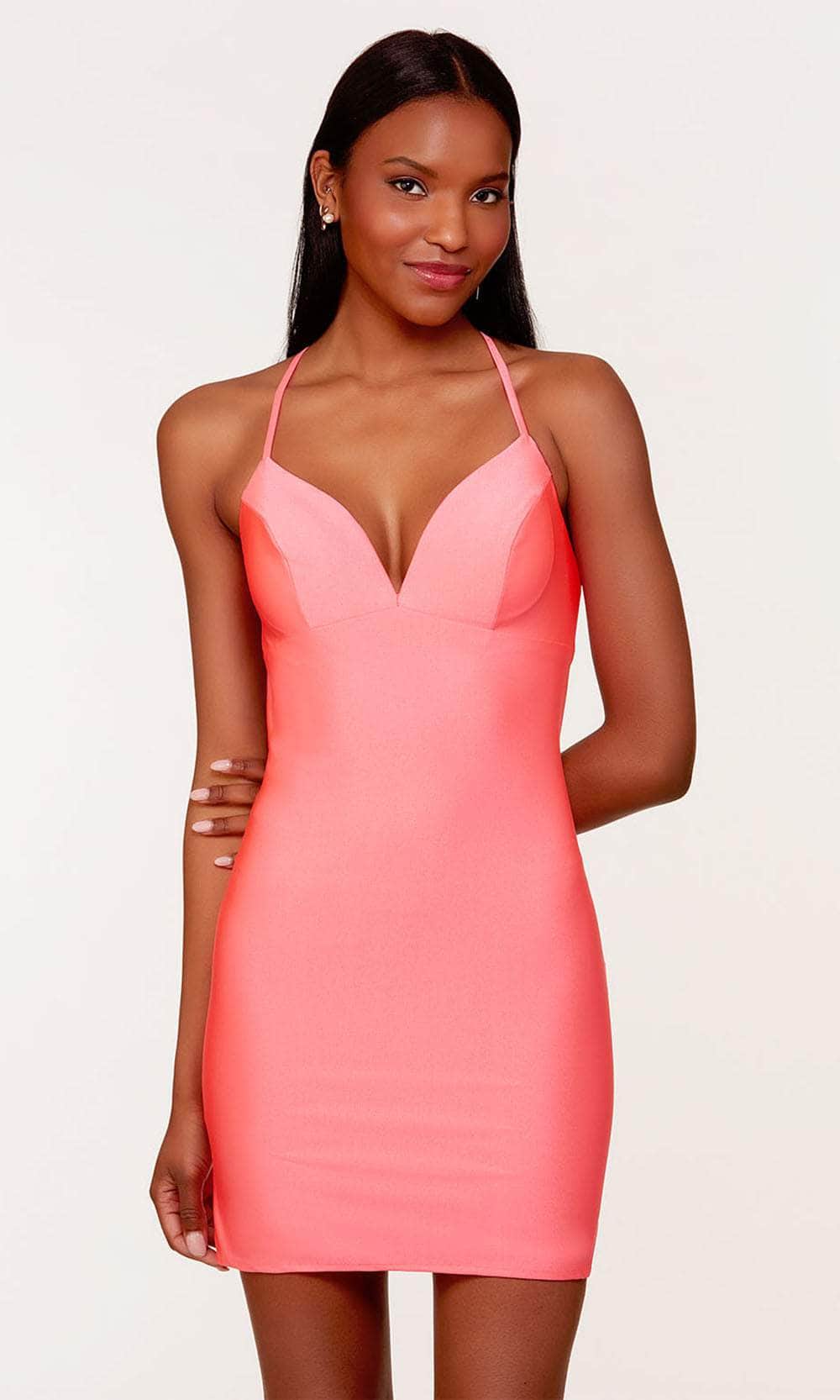 Strut your stuff in this head-turning Alyce Paris 4695 creation. This simply breathtaking dress is fashioned in comfortable power jersey fabric. It unveils a deep v-neckline, empire waist and is held by adjustable spaghetti straps. A daring open back displays a crisscross strap design for supports and a ruched knot detail at the bottom. This dress is completed in a sheath skirt that flawlessly slides to the mid-thigh hem. You are statuesque in a posed dress from Alyce Paris 4695. Models are wearing the Atomic Orange, Hyper Pink, and Citronelle colors.