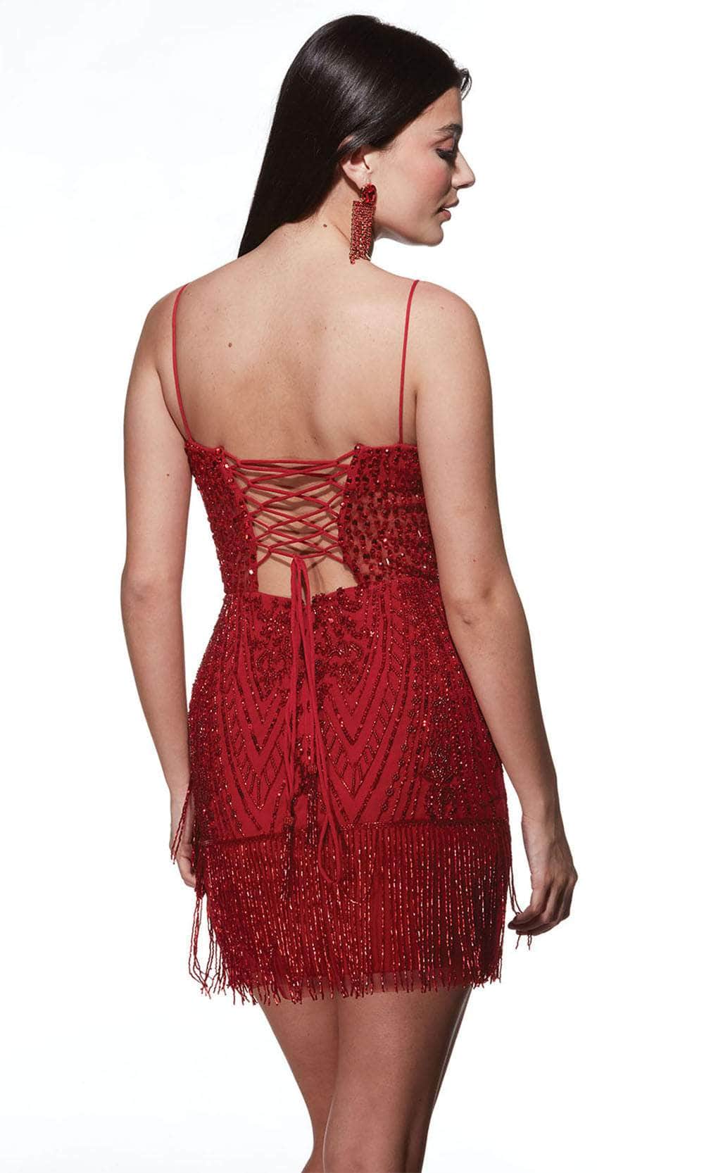 Look chic and seductive in this marvelous Alyce Paris 4805 cocktail dress. Everyone will be enchanted when they see you wearing this mesmerizing dress which features an alluring scoop neckline on a fitted and sleeveless bodice with an illusion corset style, complemented by spaghettis straps for added support. It also reveals a mid-open back that is enclosed by lace for a sophisticated finish. Additionally, the entirety of this sheath attire is designed with the combination of bead embellishments, crystal beads, and fringes, elevating its overall appeal. Dance all night in this dazzling Alyce Paris 4805 masterpiece. Models are wearing Black, Red, and Royal colors.