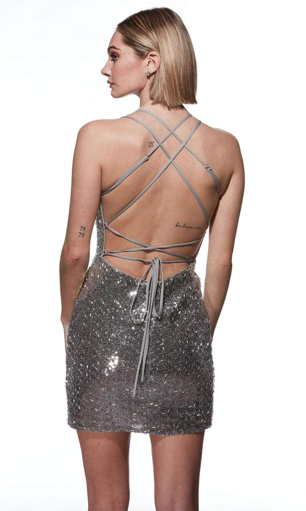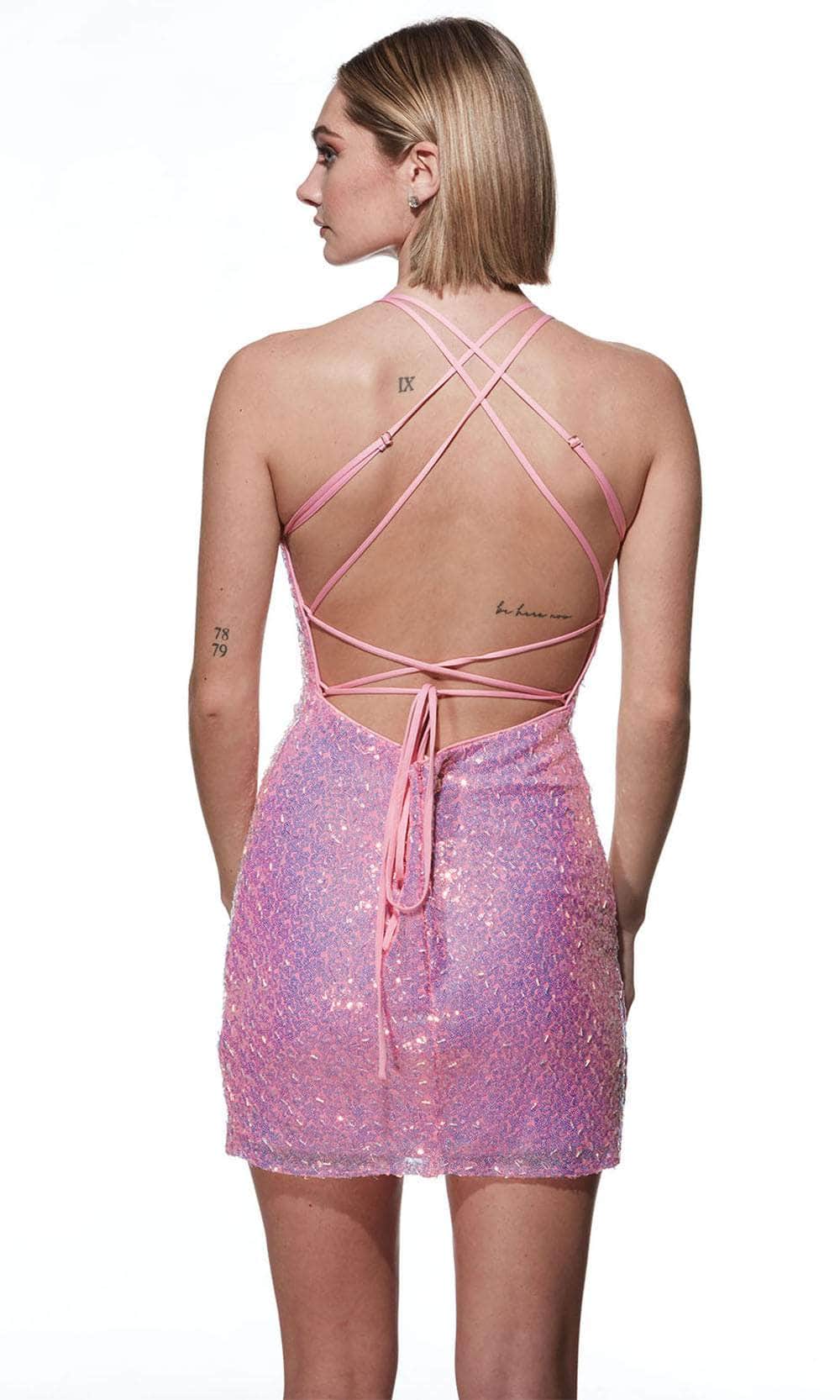 Shine brighter than ever in the Alyce Paris 4809 dress, designed to make a lasting impression. Covered in sequins, this dress exudes charm and sparkle with every movement. The stylish scoop neckline perfectly complements the sultry open back, which is secured by a strappy lace-up tie closure for a comfortable and alluring fit. The sheath skirt hugs your figure, finishing at a flattering mid-thigh length. Choose the Alyce Paris 4809 dress for an unforgettable night of fashion and confidence. Models are wearing Black, Bubblegum, and Silver colors.