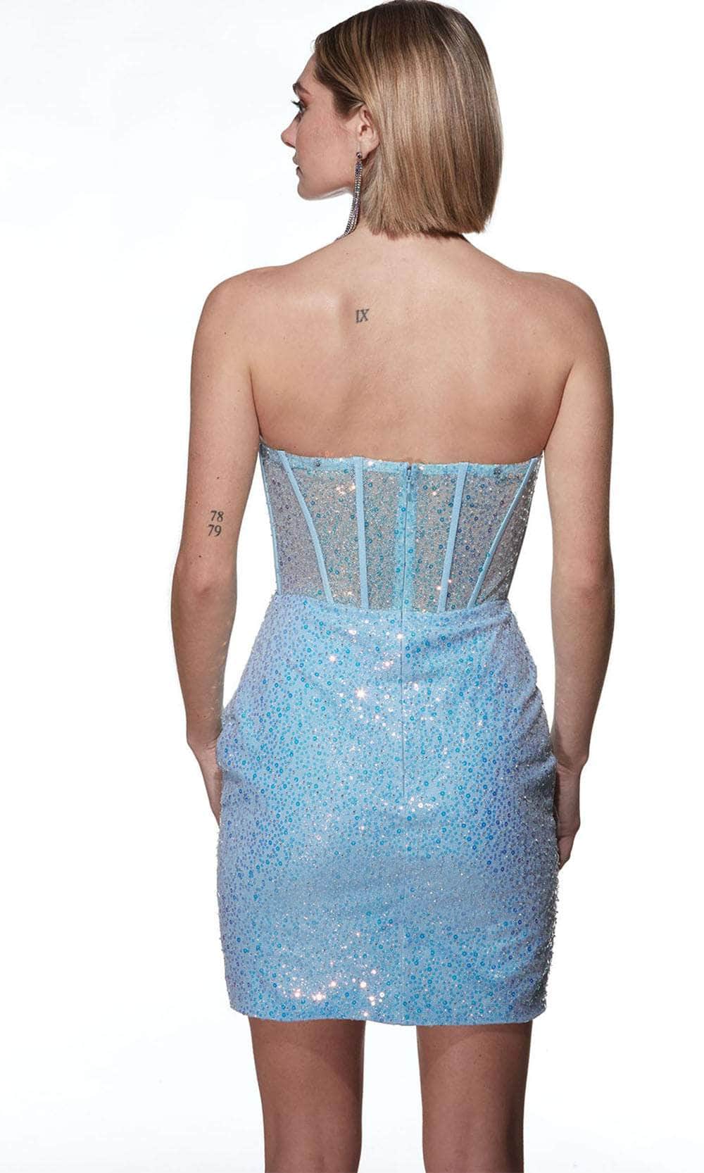 Shine like a star in this dazzling Alyce Paris 4826 masterpiece, adorned with sparkling sequins that shimmer from every angle. The strapless boned bodice offers a structured, form-fitting design, while the sweetheart neckline adds a touch of romance. A back zipper closure ensures a secure fit, allowing you to dance the night away with confidence. The short sheath silhouette skirt, designed in a wrapped-up style with ruched details, flatters your figure and adds a chic, contemporary finish. Alyce Paris 4826 is perfect for glamorous events where you want to turn heads. Models are wearing Light Blue, Sea Glass, and Wine colors.