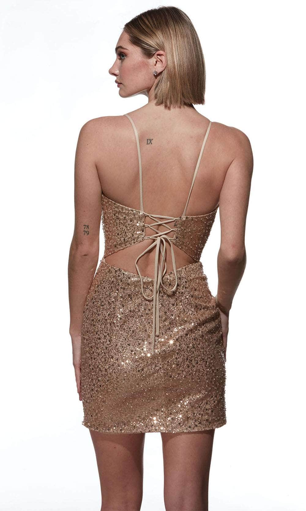 Stand out as the life of the party with this captivating Alyce Paris 4831 dress. Designed to showcase your figure in style, this dress is lavishly adorned with sequins that will have you sparkling all night. The spaghetti straps and sleeveless design provide a comfortable and stylish fit. It also highlights the daring scoop neckline, and a cutout back with strappy lace-up tie closure that gives an unexpected twist. A sheath skirt that cascade to the mid-thigh hem creates a flirty finish, making it ideal for any fun-filled event. Fall in love when you slip on this Alyce Paris 4831 creation. Models are wearing Light Gold, and Light Pink colors.