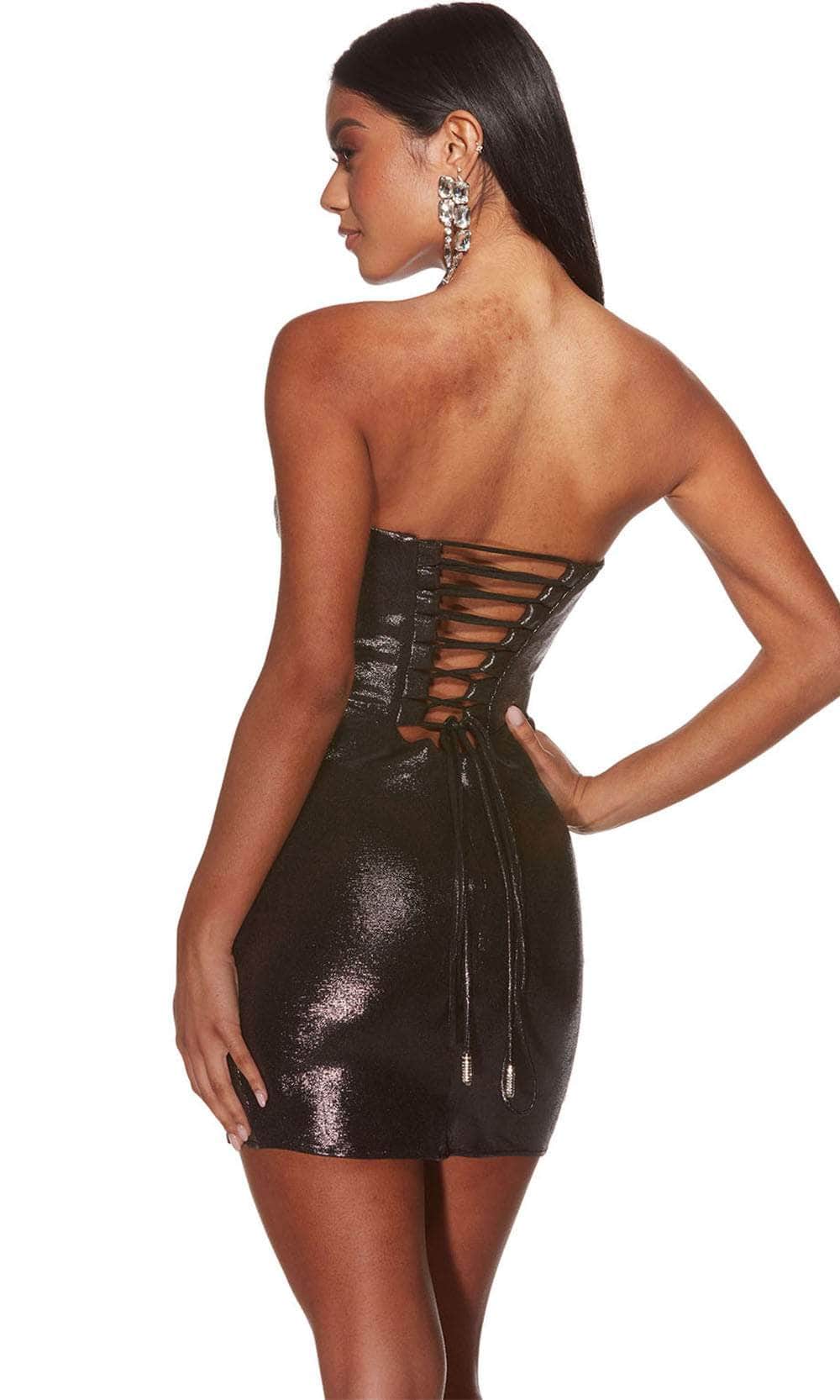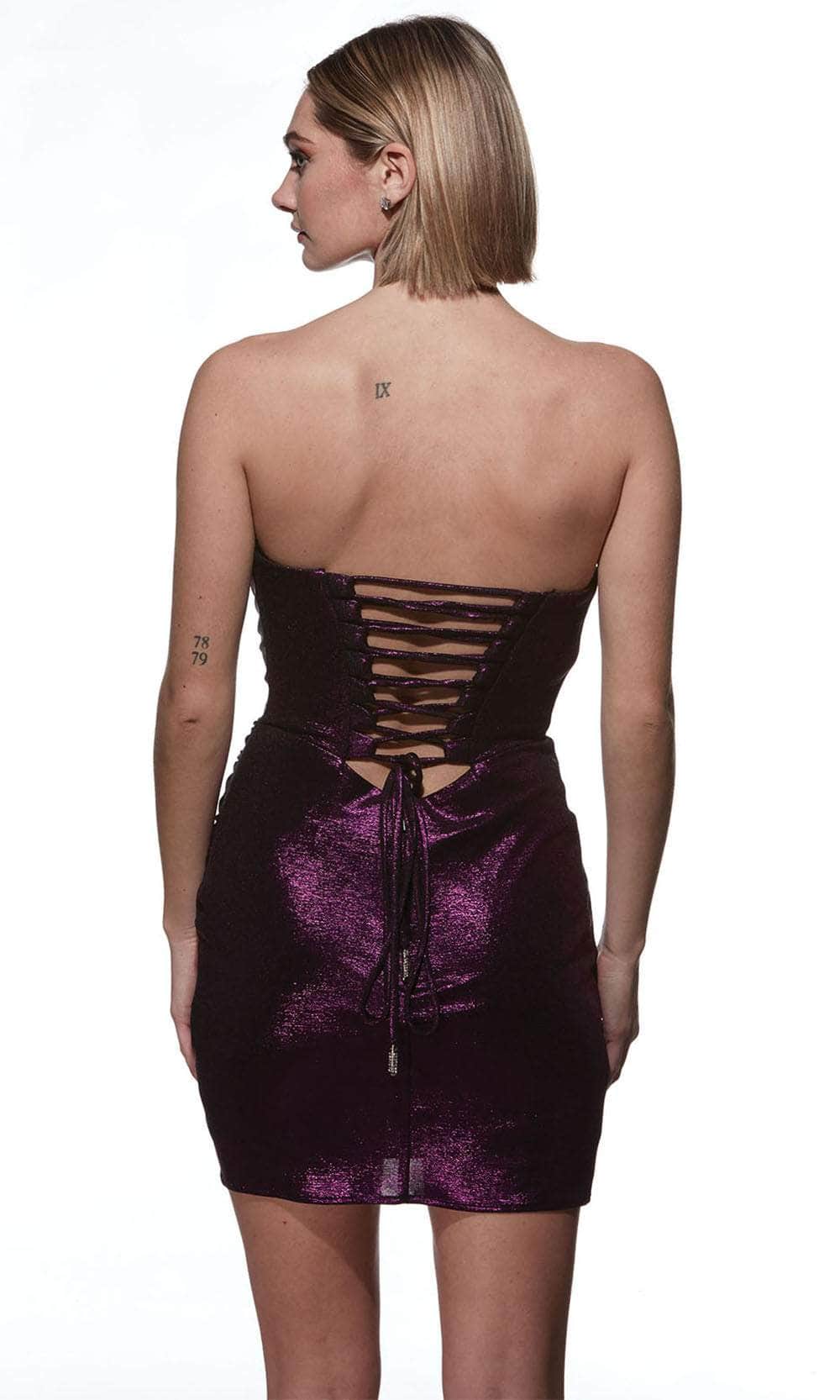 Embrace your inner fashion icon in this Alyce Paris 4846 masterpiece. Made from metallic jersey fabric with ruching detail throughout, this piece hugs your curves beautifully and shimmer under the lights. The strapless style and sweetheart neckline add a touch of romance, while the open back with a lace-up closure offers a chic vibe and adjustable fit. The tulip hem adds a unique twist to the sheath skirt, which cascade gracefully to the short hemline. This Alyce Paris 4846 short dress perfect for any special night out. Models are wearing Gunmetal, and Neon Magenta colors.